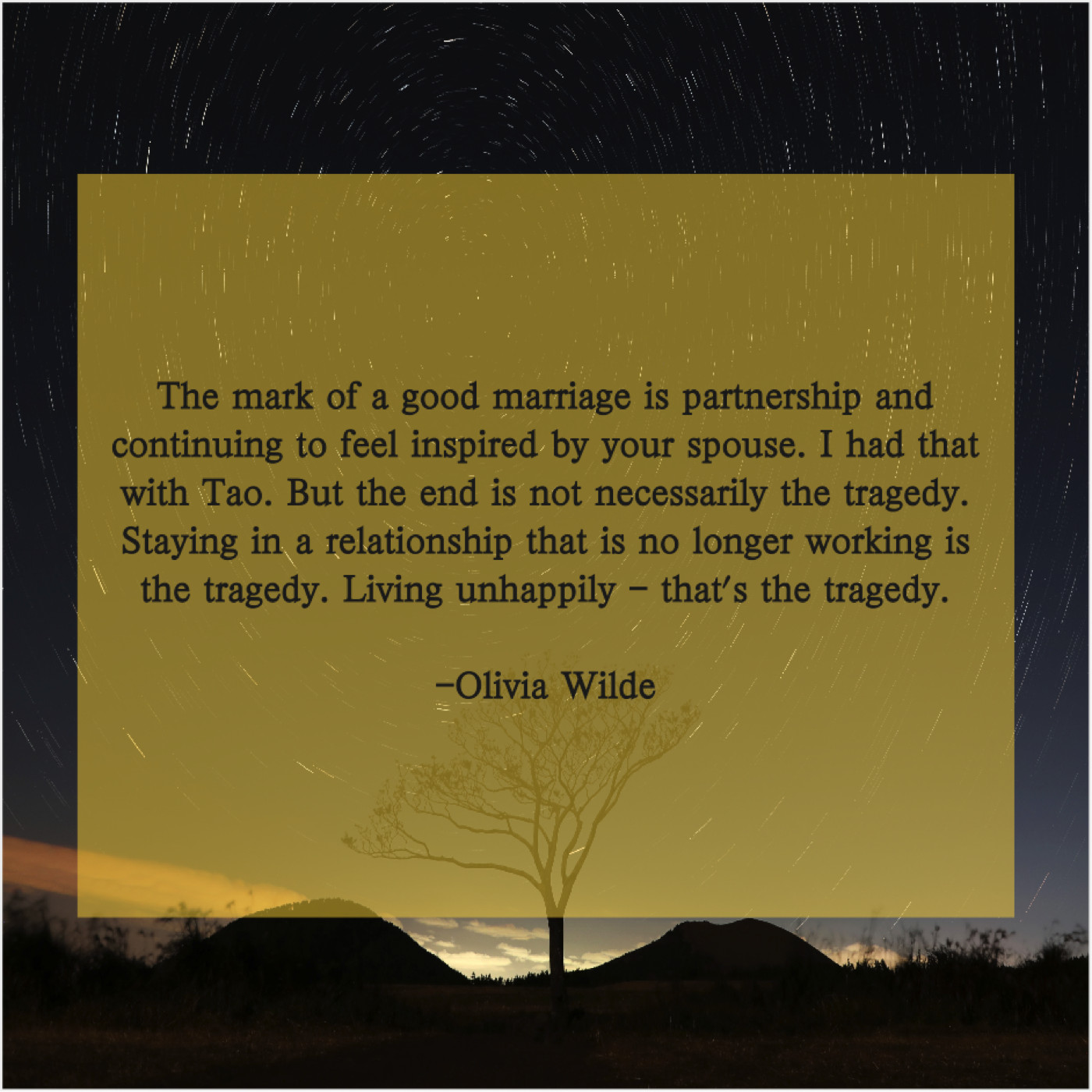 “The mark of a good marriage is partnership and continuing to feel inspired by your spouse. I had that with Tao. But the end is not necessarily the tragedy. Staying in a relationship that is no longer working is the tragedy. Living unhappily – that’s the tragedy.”