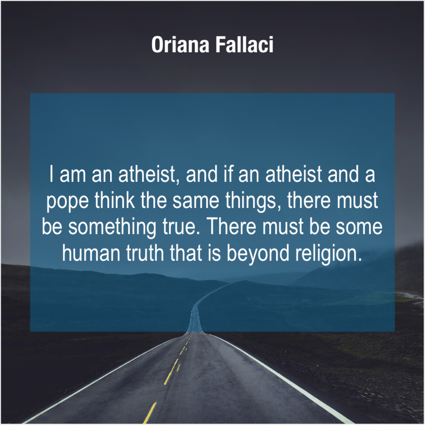 Oriana Fallaci Oriana Fallaci – I am an atheist, and… January 1, 2019 admin “I am an atheist, and if an atheist and a pope think the same things, there must be something true. There must be some human truth that is beyond religion.”-Oriana Fallaci