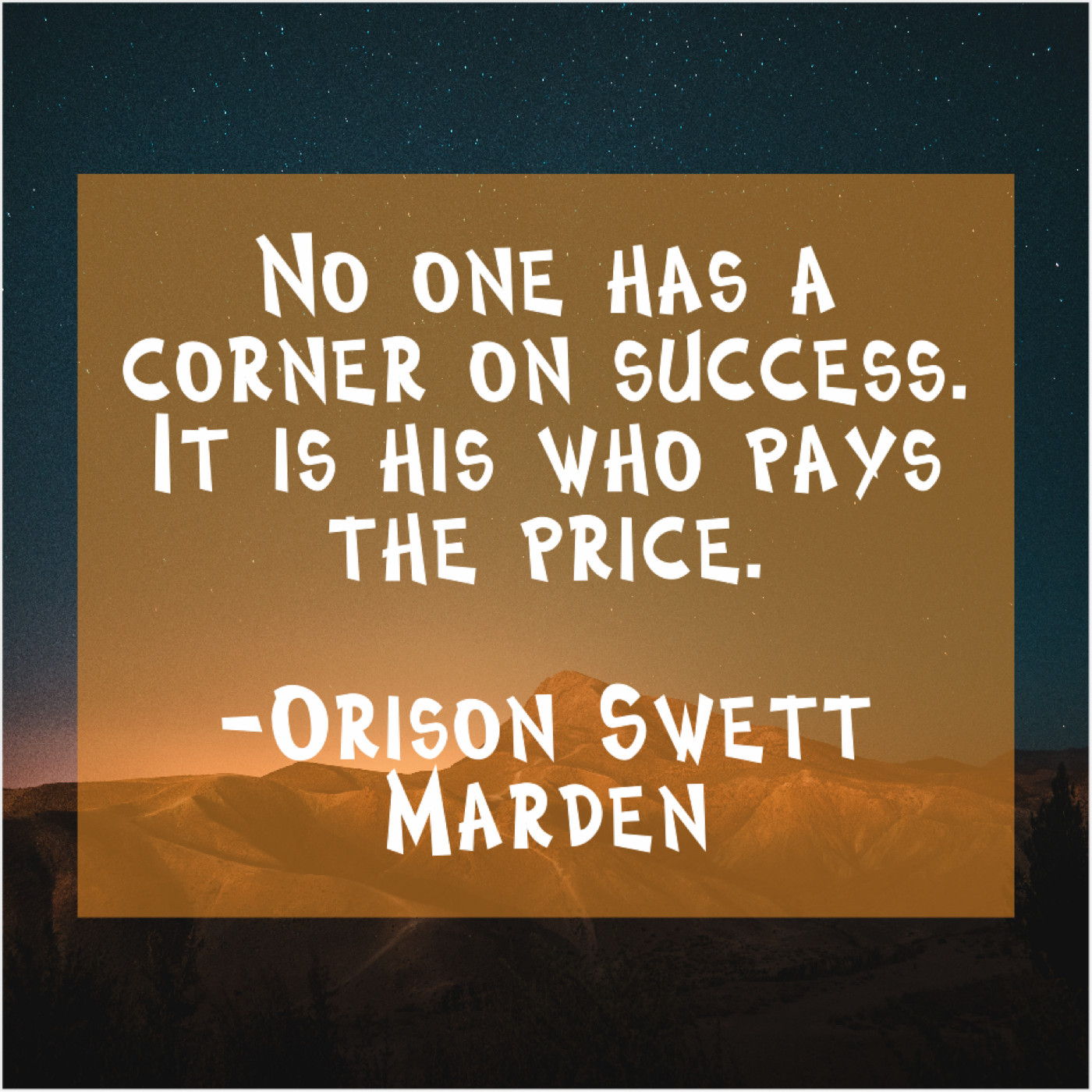 Orison Swett Marden Orison Swett Marden – No one has a corner… October 3, 2019 admin “No one has a corner on success. It is his who pays the price.”-Orison Swett Marden