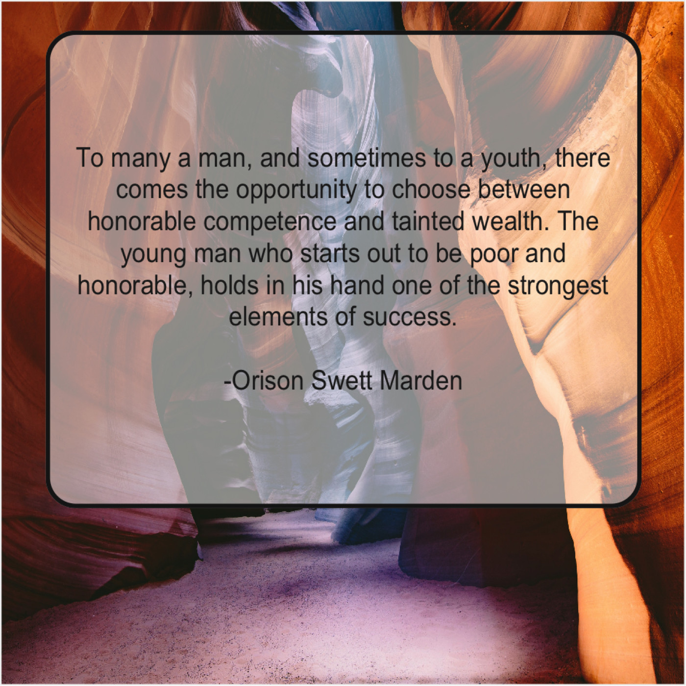 “To many a man, and sometimes to a youth, there comes the opportunity to choose between honorable competence and tainted wealth. The young man who starts out to be poor and honorable, holds in his hand one of the strongest elements of success.”
