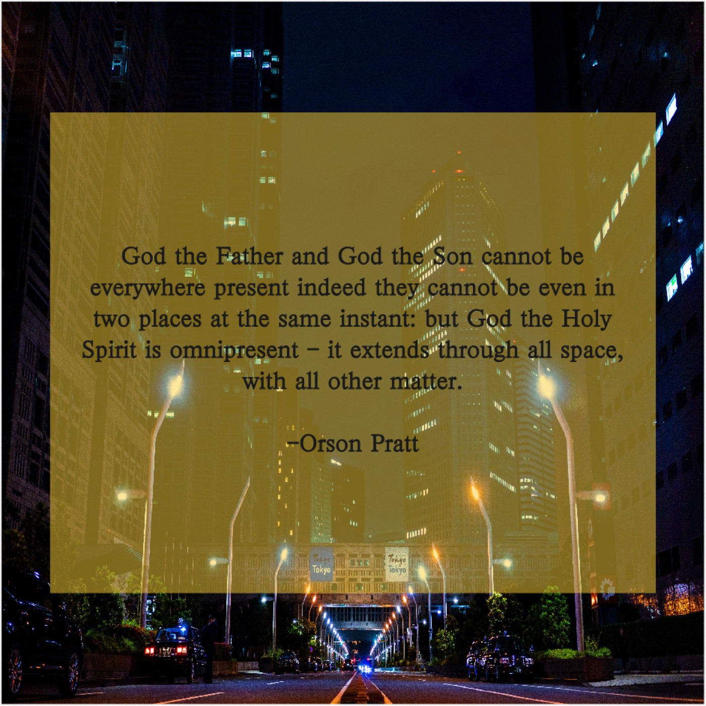 Orson Pratt Orson Pratt – God the Father and God… March 23, 2019 admin “God the Father and God the Son cannot be everywhere present indeed they cannot be even in two places at the same instant: but God the Holy Spirit is omnipresent – it extends through all space, with all other matter.”-Orson Pratt