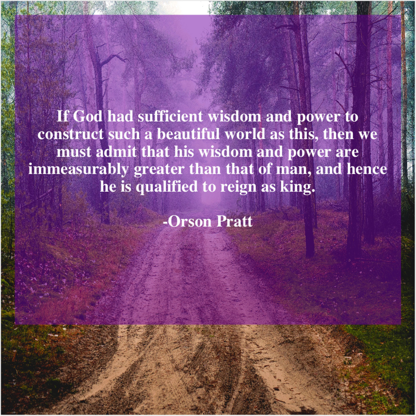 Orson Pratt Orson Pratt – If God had sufficient wisdom… May 12, 2019 admin “If God had sufficient wisdom and power to construct such a beautiful world as this, then we must admit that his wisdom and power are immeasurably greater than that of man, and hence he is qualified to reign as king.”-Orson Pratt