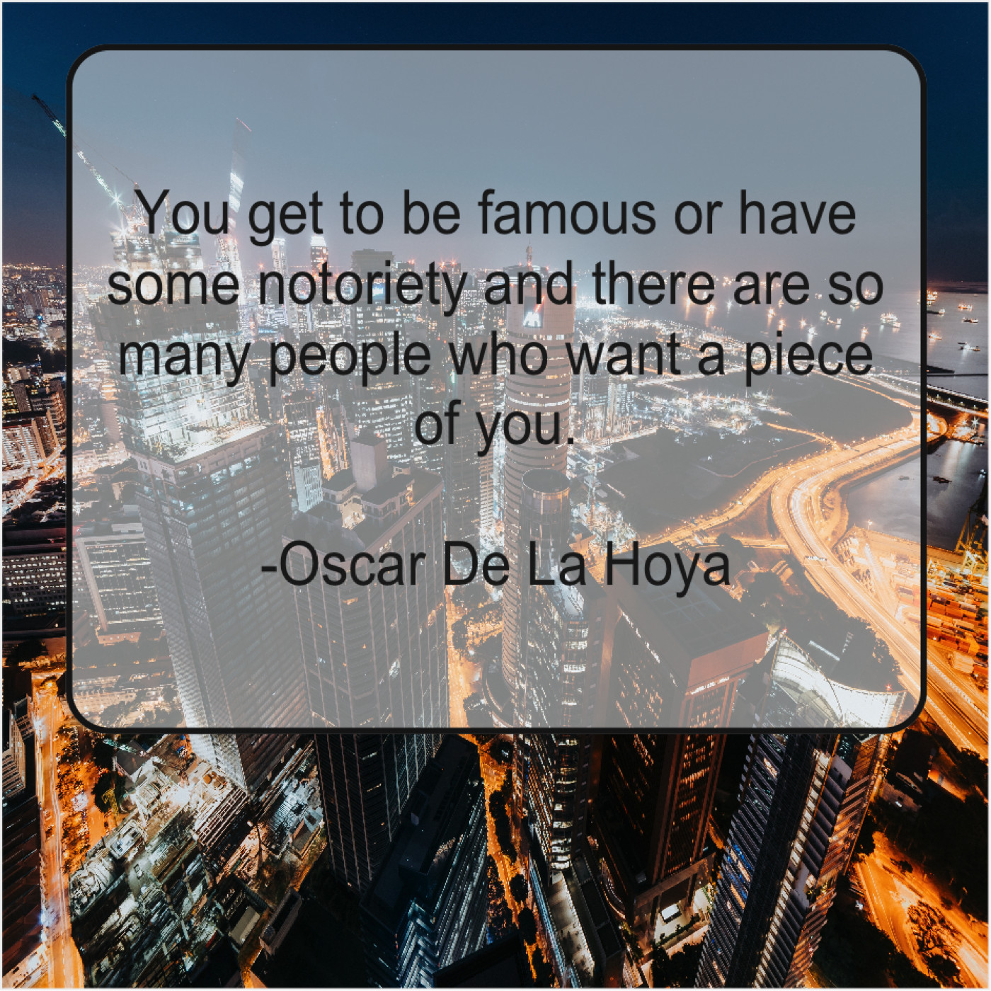Oscar De La Hoya Oscar De La Hoya – You get to be famous… December 3, 2018 admin “You get to be famous or have some notoriety and there are so many people who want a piece of you.”-Oscar De La Hoya