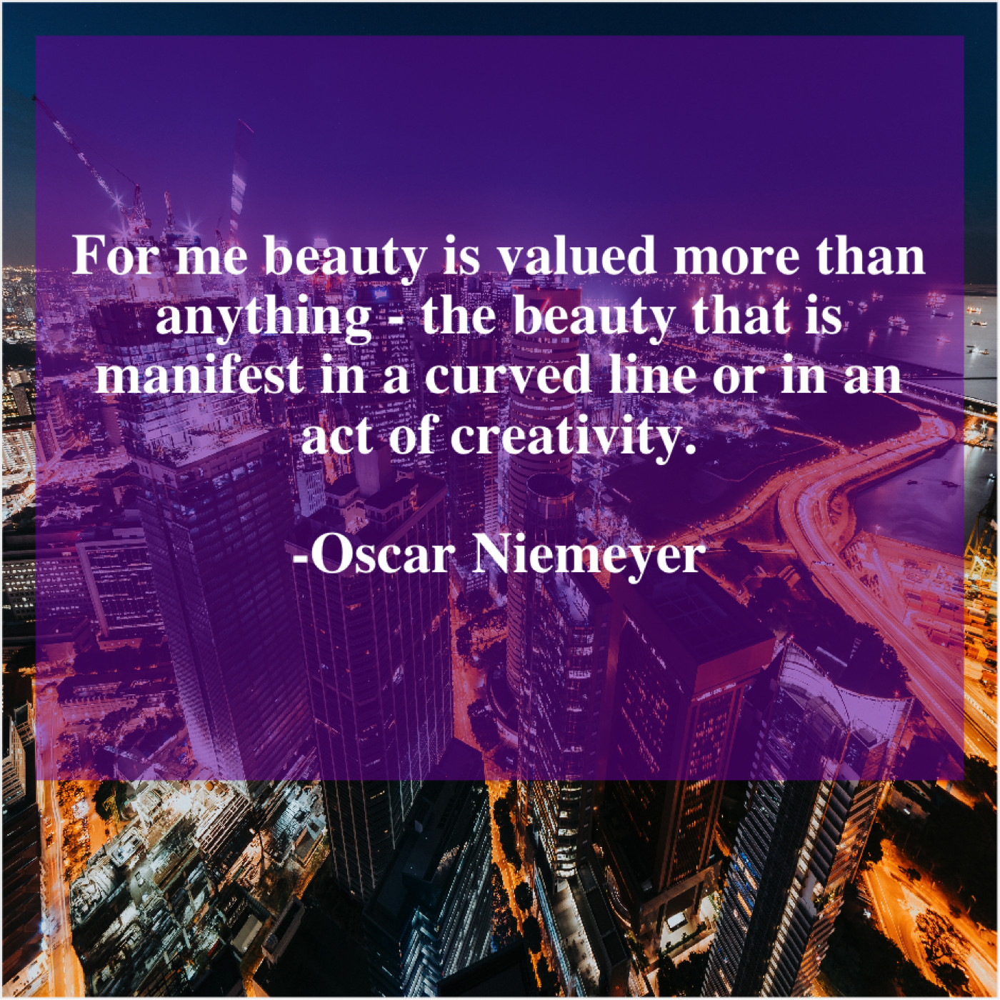 Oscar Niemeyer Oscar Niemeyer – For me beauty is valued… February 7, 2019 admin “For me beauty is valued more than anything – the beauty that is manifest in a curved line or in an act of creativity.”-Oscar Niemeyer