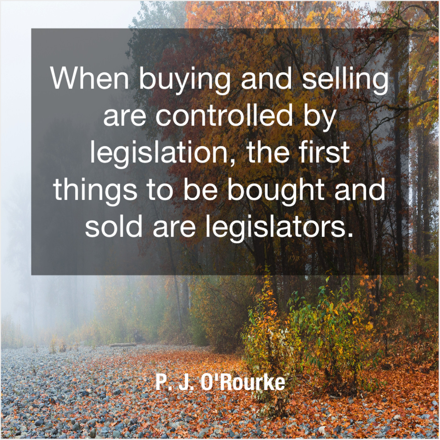 P. J. O'Rourke P. J. O’Rourke – When buying and selling are… December 20, 2018 admin “When buying and selling are controlled by legislation, the first things to be bought and sold are legislators.”-P. J. O’Rourke