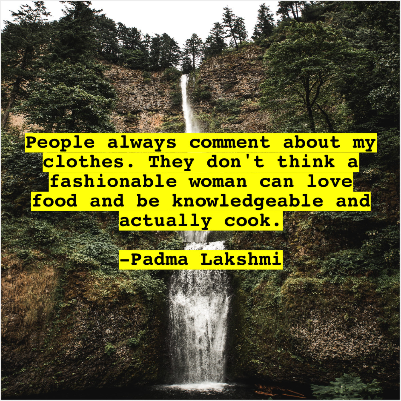Padma Lakshmi Padma Lakshmi – People always comment about my… September 2, 2019 admin “People always comment about my clothes. They don’t think a fashionable woman can love food and be knowledgeable and actually cook.”-Padma Lakshmi
