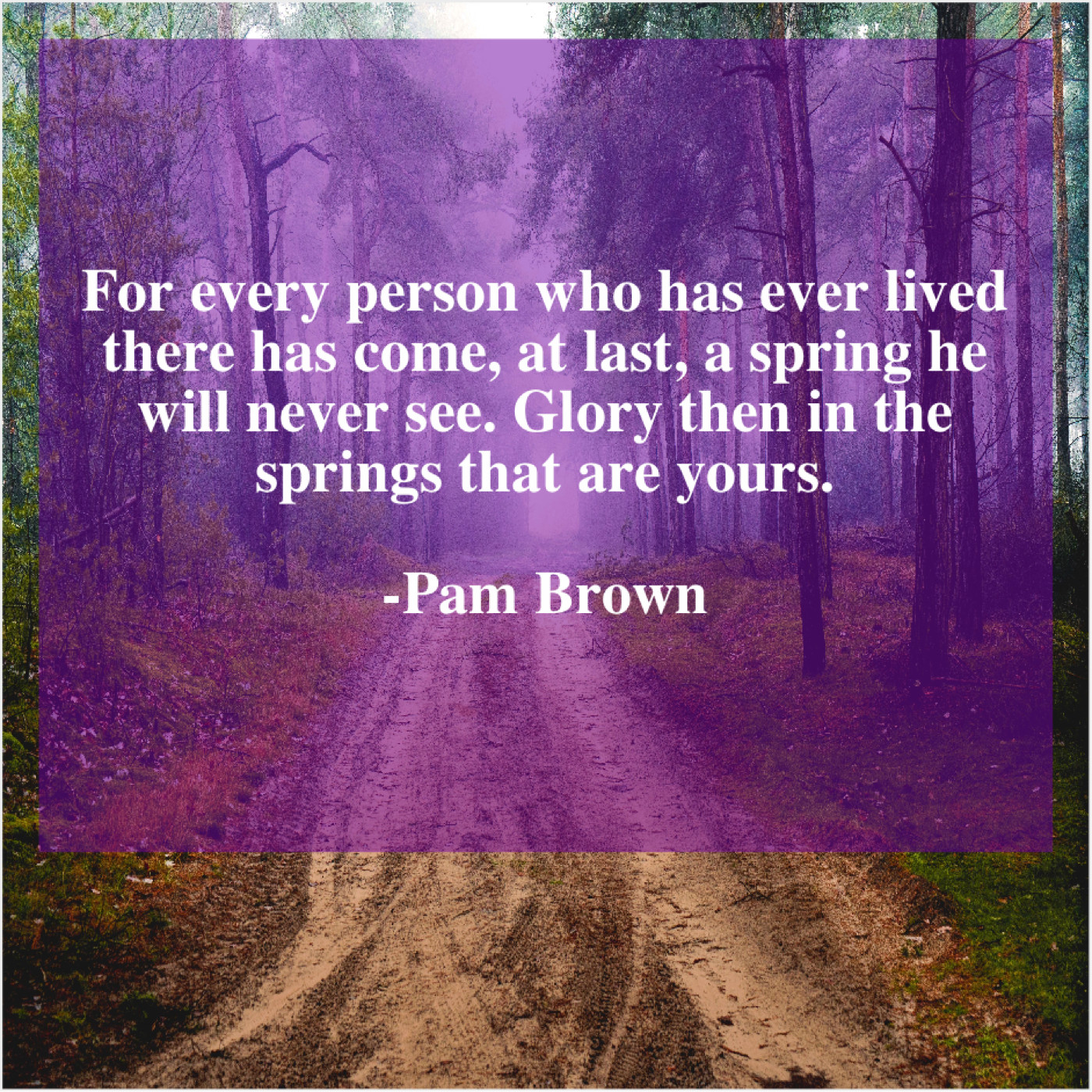 Pam Brown Pam Brown – For every person who has… February 21, 2019 admin “For every person who has ever lived there has come, at last, a spring he will never see. Glory then in the springs that are yours.”-Pam Brown