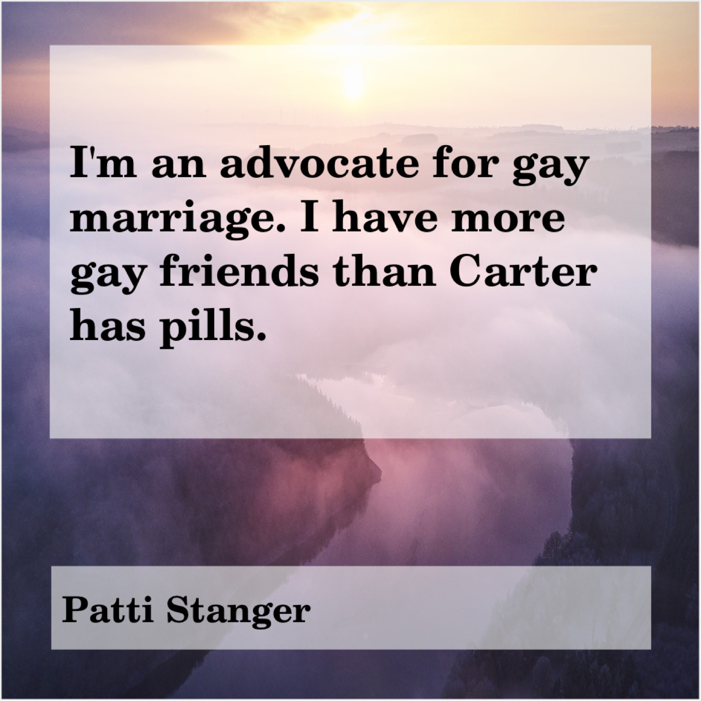 Patti Stanger Patti Stanger – I’m an advocate for gay… April 18, 2019 admin “I’m an advocate for gay marriage. I have more gay friends than Carter has pills.”-Patti Stanger