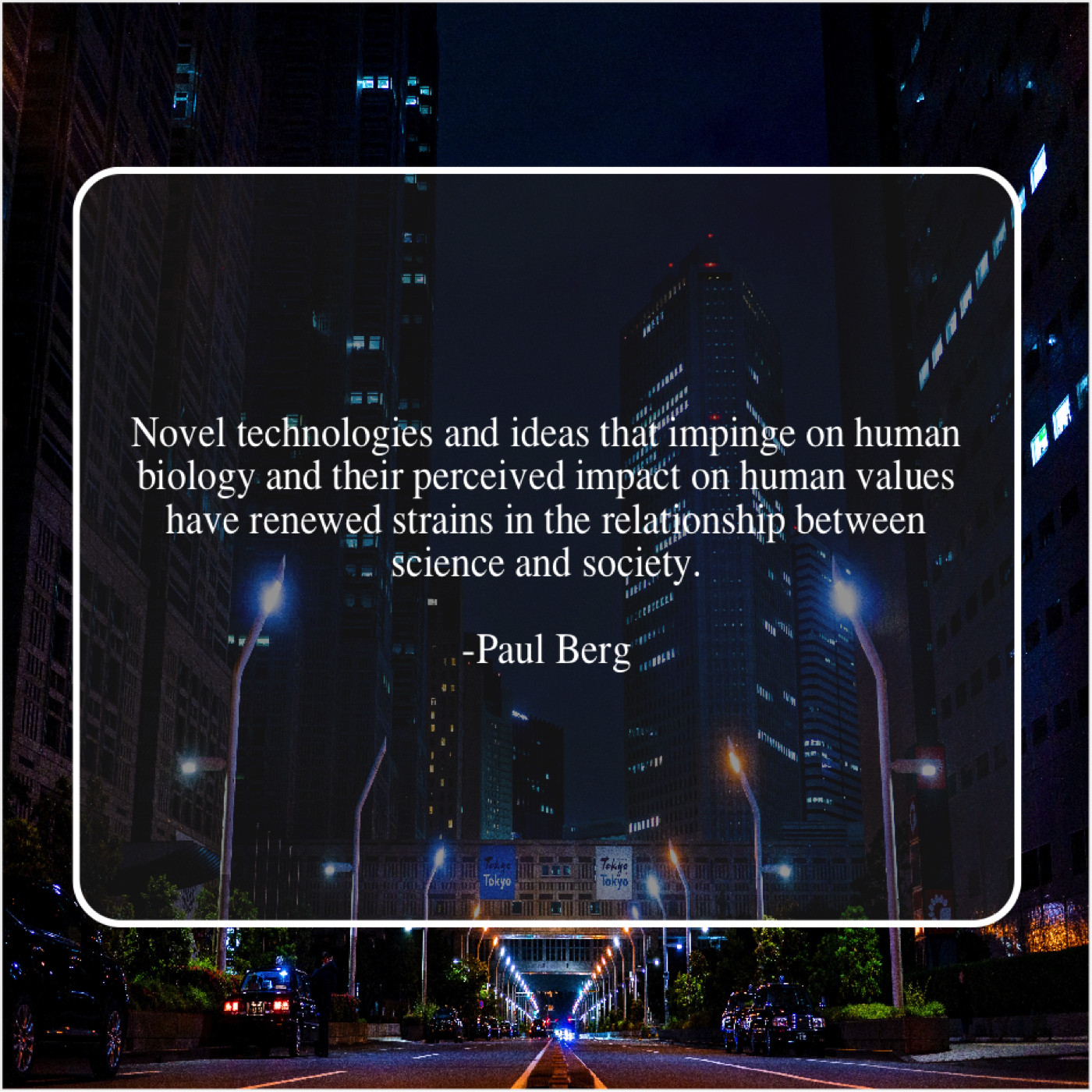 Paul Berg Paul Berg – Novel technologies and ideas that… October 19, 2019 admin “Novel technologies and ideas that impinge on human biology and their perceived impact on human values have renewed strains in the relationship between science and society.”-Paul Berg