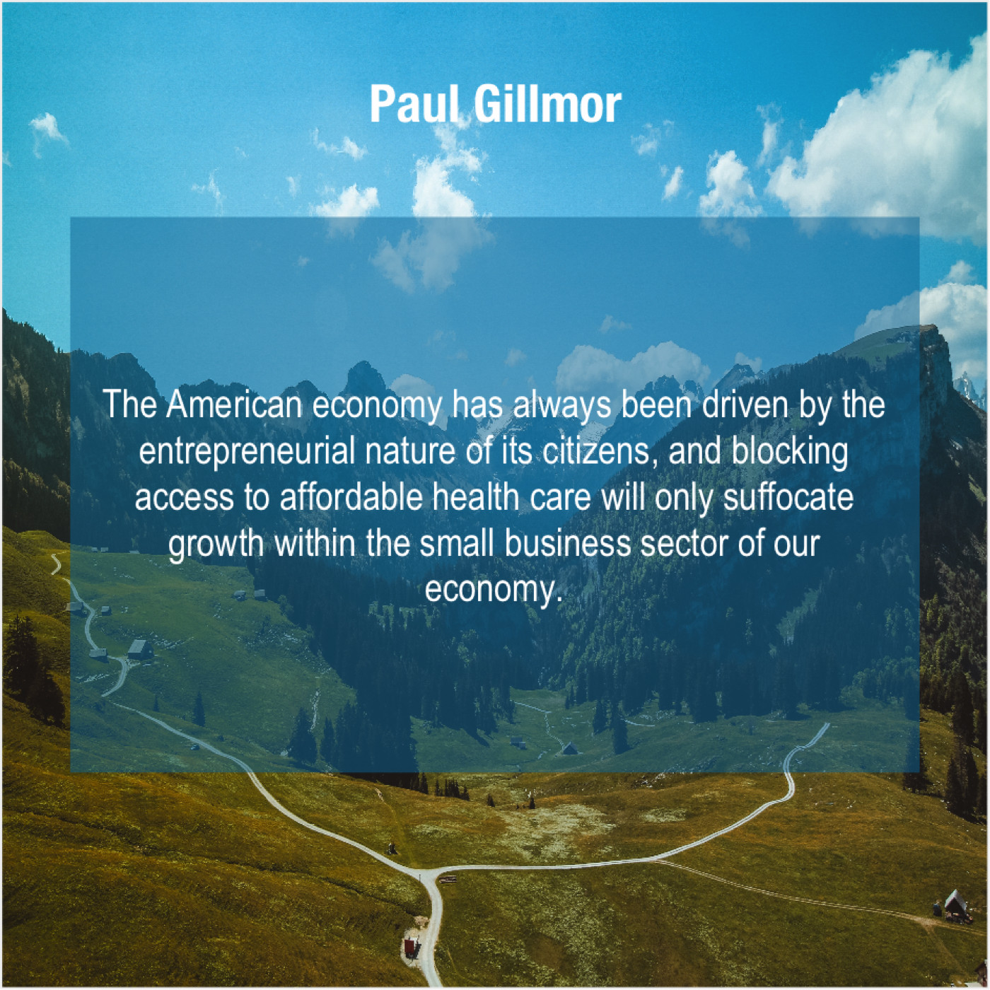 Paul Gillmor Paul Gillmor – The American economy has always… October 21, 2019 admin “The American economy has always been driven by the entrepreneurial nature of its citizens, and blocking access to affordable health care will only suffocate growth within the small business sector of our economy.”-Paul Gillmor