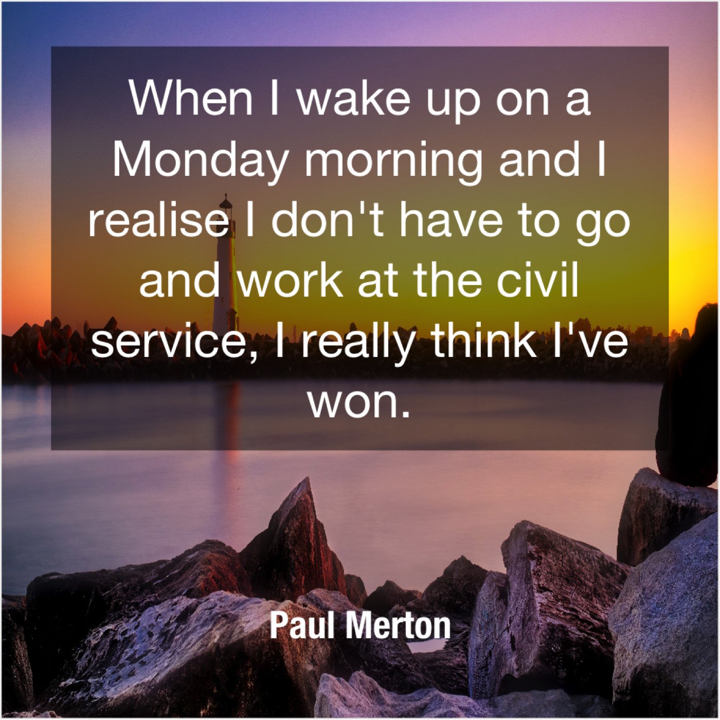 Paul Merton Paul Merton – When I wake up on… October 23, 2019 admin “When I wake up on a Monday morning and I realise I don’t have to go and work at the civil service, I really think I’ve won.”-Paul Merton