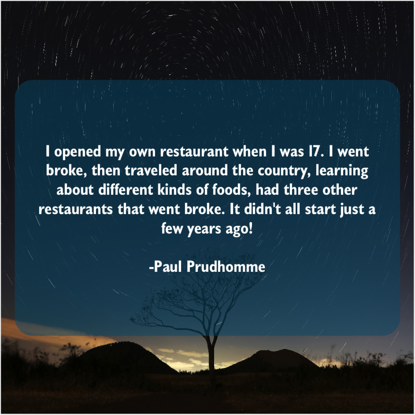 Paul Prudhomme Paul Prudhomme – I opened my own restaurant… December 8, 2018 admin “I opened my own restaurant when I was 17. I went broke, then traveled around the country, learning about different kinds of foods, had three other restaurants that went broke. It didn’t all start just a few years ago!”-Paul Prudhomme