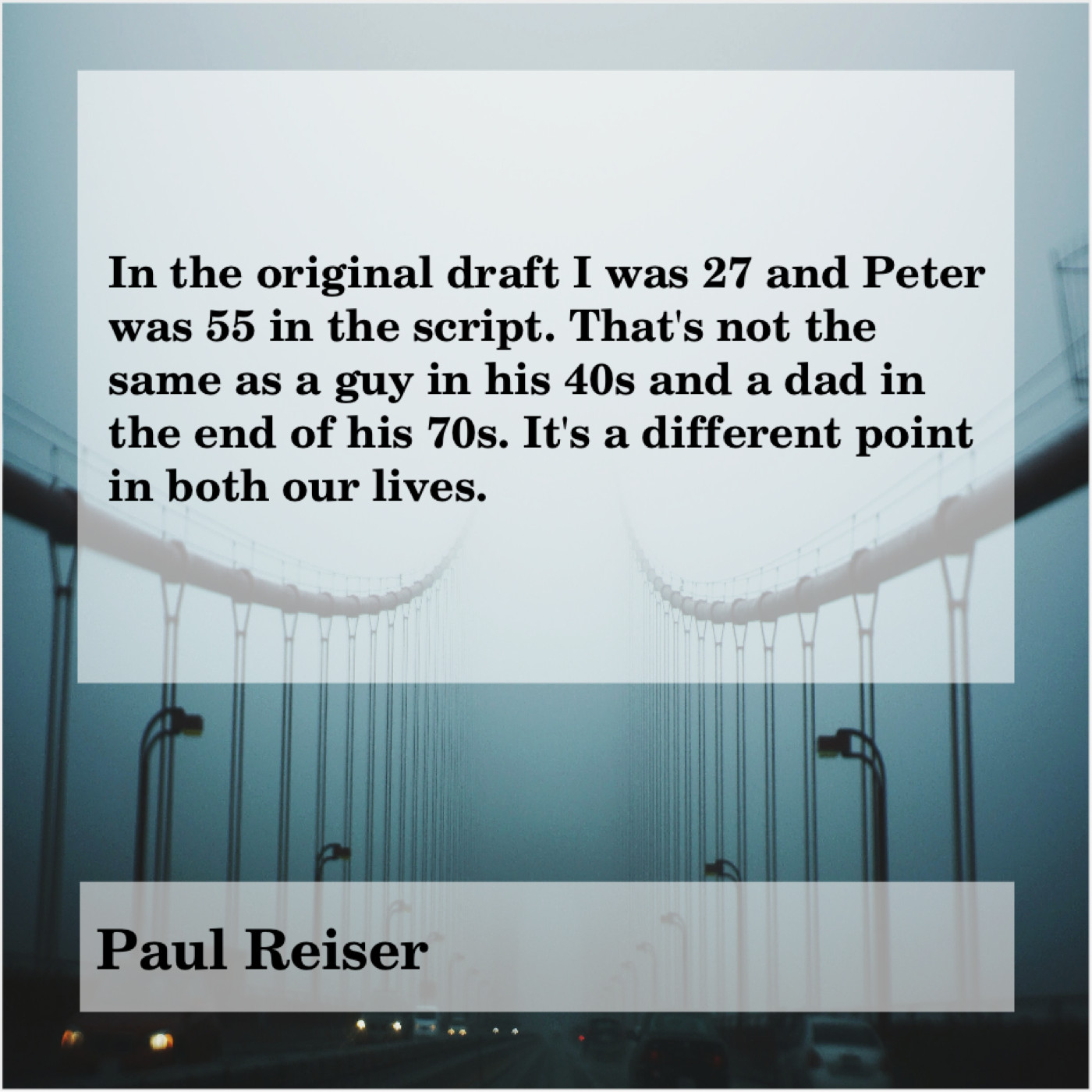 Paul Reiser Paul Reiser – In the original draft I… February 14, 2019 admin “In the original draft I was 27 and Peter was 55 in the script. That’s not the same as a guy in his 40s and a dad in the end of his 70s. It’s a different point in both our lives.”-Paul Reiser