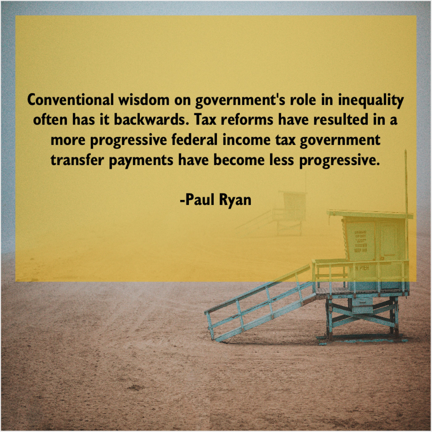 Paul Ryan Paul Ryan – Conventional wisdom on government’s role… October 12, 2019 admin “Conventional wisdom on government’s role in inequality often has it backwards. Tax reforms have resulted in a more progressive federal income tax government transfer payments have become less progressive.”-Paul Ryan