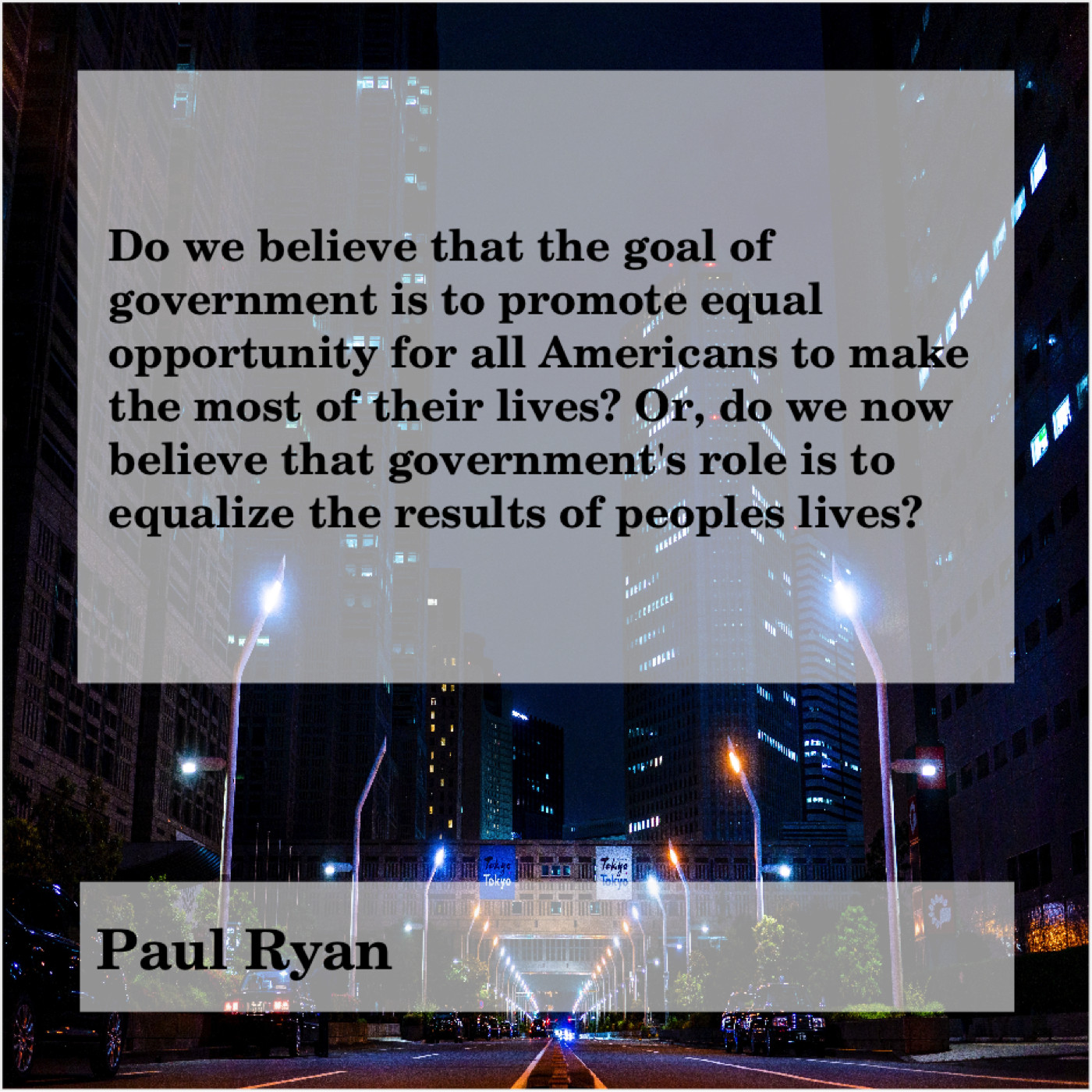 Paul Ryan Paul Ryan – Do we believe that the… February 11, 2019 admin “Do we believe that the goal of government is to promote equal opportunity for all Americans to make the most of their lives? Or, do we now believe that government’s role is to equalize the results of peoples lives?”-Paul Ryan