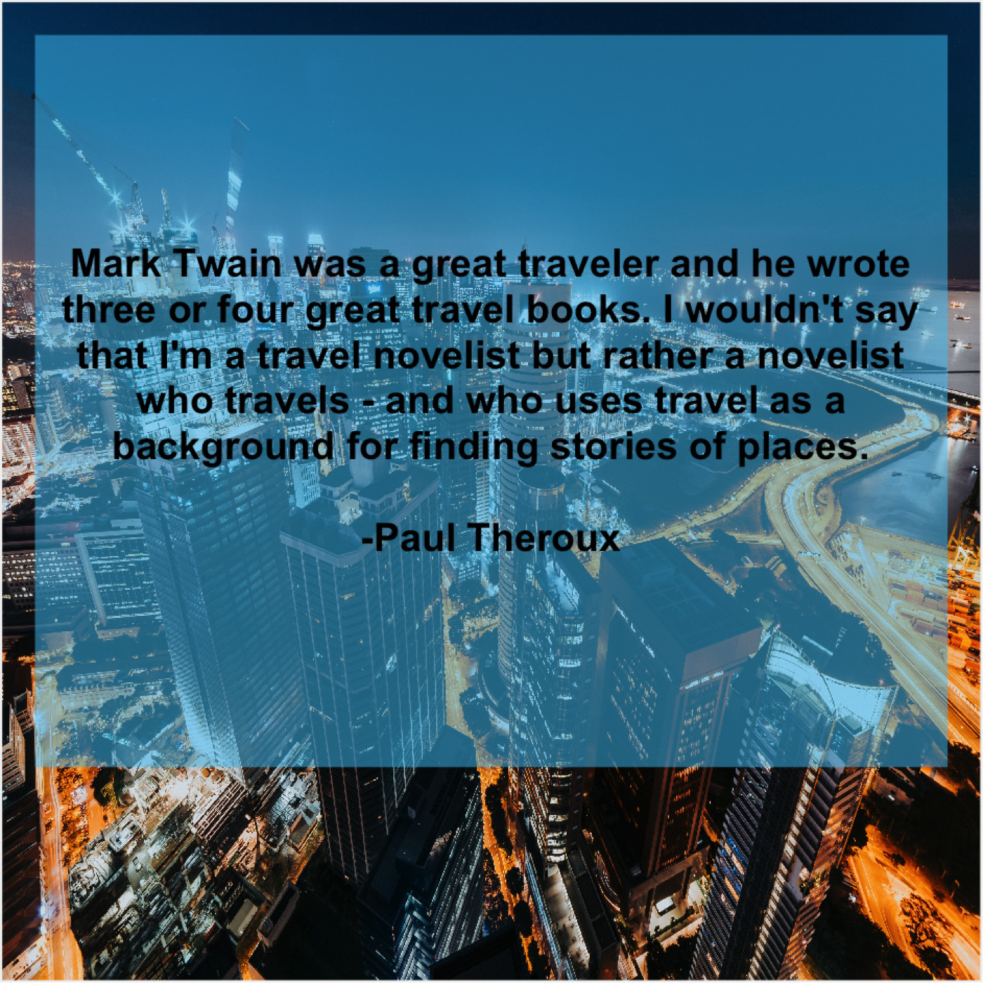 Paul Theroux Paul Theroux – Mark Twain was a great… June 6, 2019 admin “Mark Twain was a great traveler and he wrote three or four great travel books. I wouldn’t say that I’m a travel novelist but rather a novelist who travels – and who uses travel as a background for finding stories of places.”-Paul Theroux