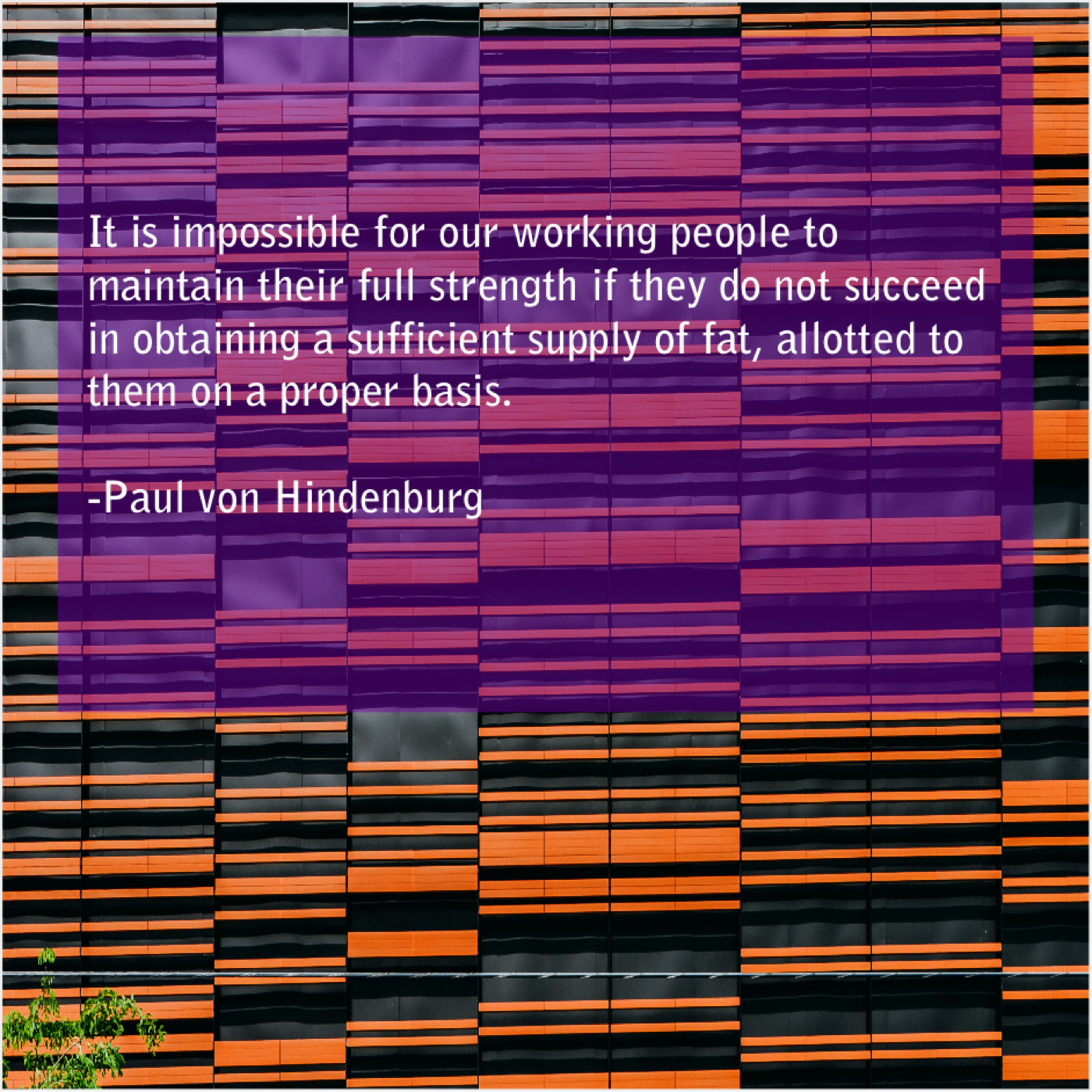 Paul von Hindenburg Paul von Hindenburg – It is impossible for our… July 7, 2019 admin “It is impossible for our working people to maintain their full strength if they do not succeed in obtaining a sufficient supply of fat, allotted to them on a proper basis.”-Paul von Hindenburg