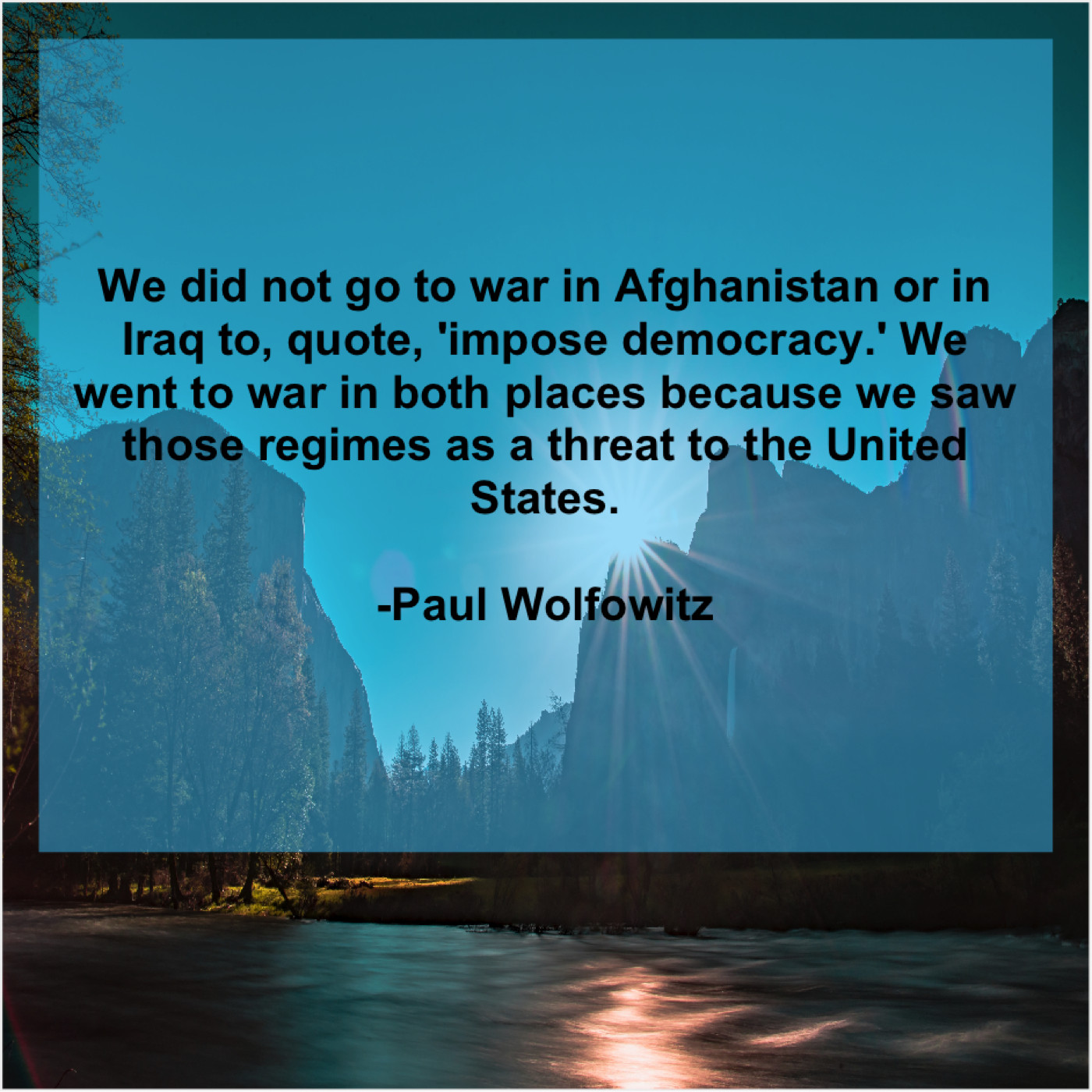 Paul Wolfowitz Paul Wolfowitz – We did not go to… March 19, 2019 admin “We did not go to war in Afghanistan or in Iraq to, quote, ‘impose democracy.’ We went to war in both places because we saw those regimes as a threat to the United States.”-Paul Wolfowitz
