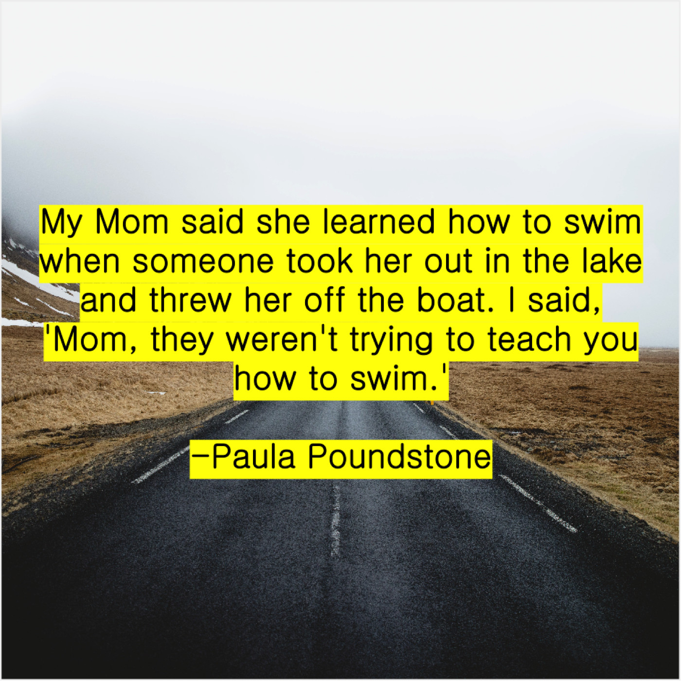 Paula Poundstone Paula Poundstone – My Mom said she learned… June 7, 2019 admin “My Mom said she learned how to swim when someone took her out in the lake and threw her off the boat. I said, ‘Mom, they weren’t trying to teach you how to swim.'”-Paula Poundstone
