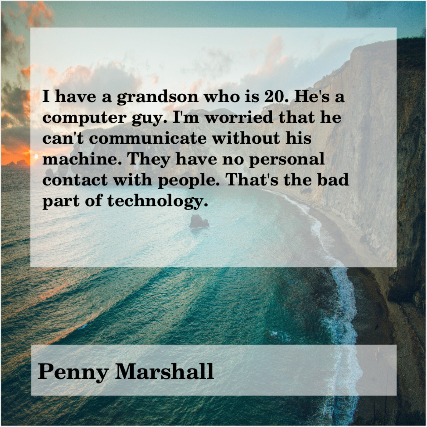 Penny Marshall Penny Marshall – I have a grandson who… October 6, 2019 admin “I have a grandson who is 20. He’s a computer guy. I’m worried that he can’t communicate without his machine. They have no personal contact with people. That’s the bad part of technology.”-Penny Marshall