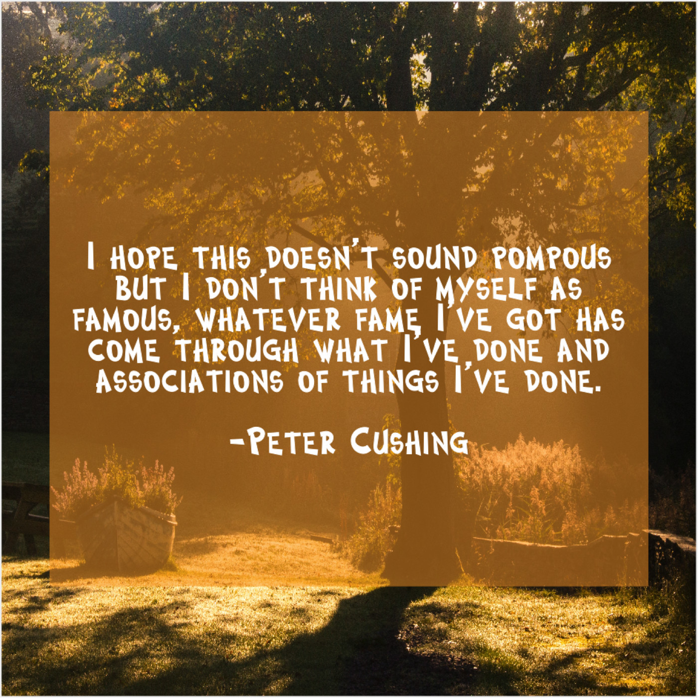 Peter Cushing Peter Cushing – I hope this doesn’t sound… March 16, 2019 admin “I hope this doesn’t sound pompous but I don’t think of myself as famous, whatever fame I’ve got has come through what I’ve done and associations of things I’ve done.”-Peter Cushing
