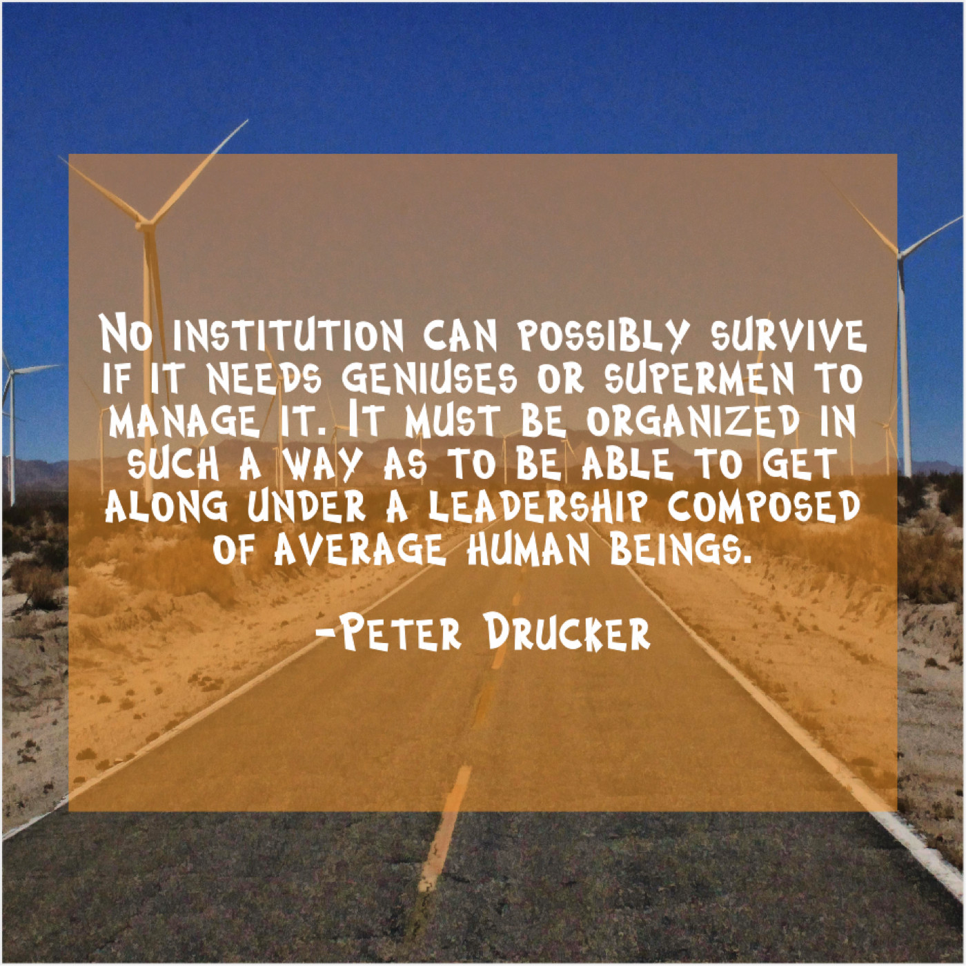 Peter Drucker Peter Drucker – No institution can possibly survive… May 4, 2019 admin “No institution can possibly survive if it needs geniuses or supermen to manage it. It must be organized in such a way as to be able to get along under a leadership composed of average human beings.”-Peter Drucker