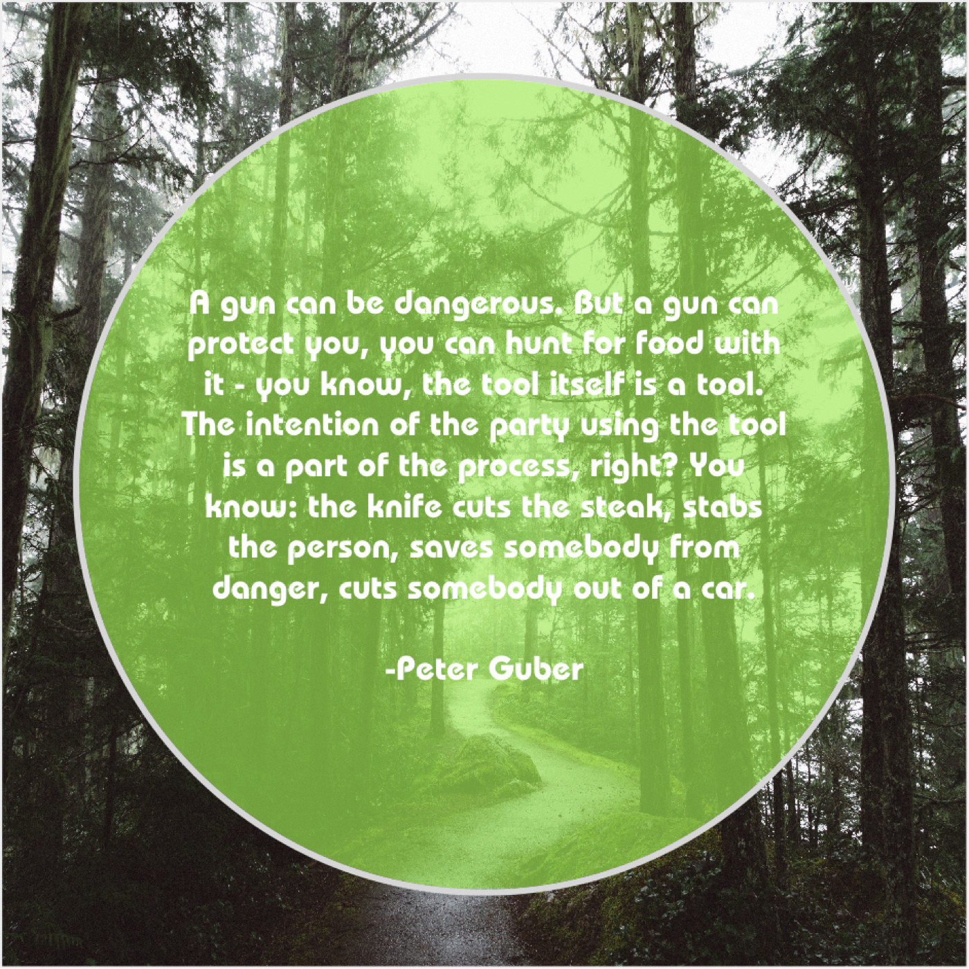 “A gun can be dangerous. But a gun can protect you, you can hunt for food with it – you know, the tool itself is a tool. The intention of the party using the tool is a part of the process, right? You know: the knife cuts the steak, stabs the person, saves somebody from danger, cuts somebody out of a car.”