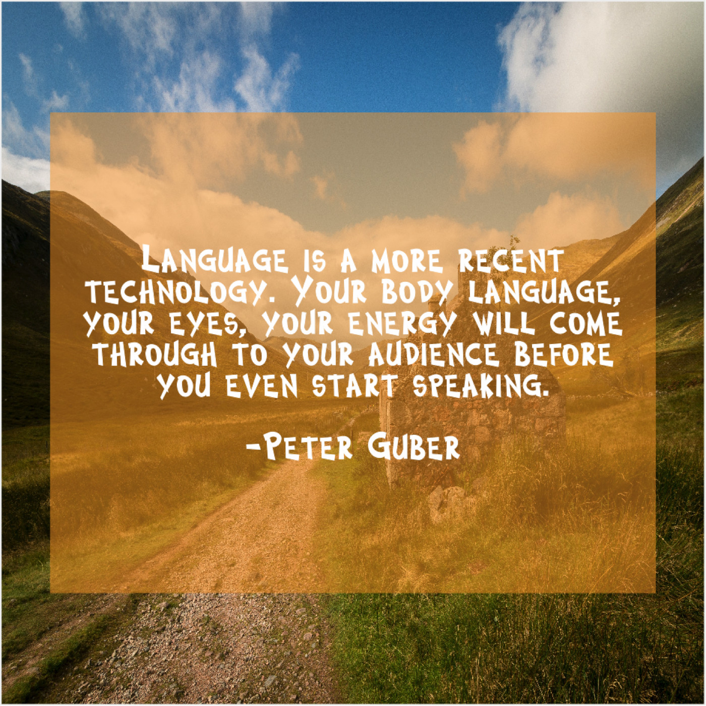 Peter Guber Peter Guber – Language is a more recent… February 8, 2019 admin “Language is a more recent technology. Your body language, your eyes, your energy will come through to your audience before you even start speaking.”-Peter Guber
