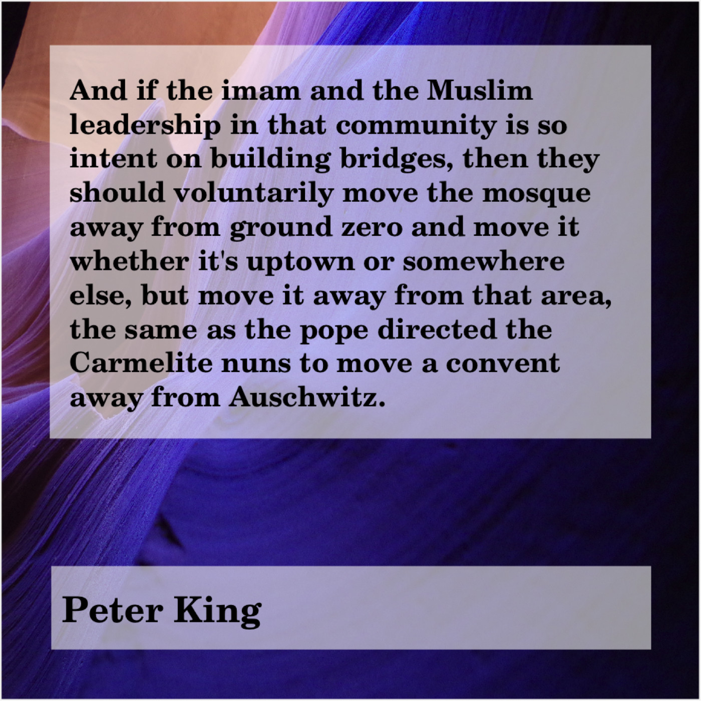 “And if the imam and the Muslim leadership in that community is so intent on building bridges, then they should voluntarily move the mosque away from ground zero and move it whether it’s uptown or somewhere else, but move it away from that area, the same as the pope directed the Carmelite nuns to move a convent away from Auschwitz.”
