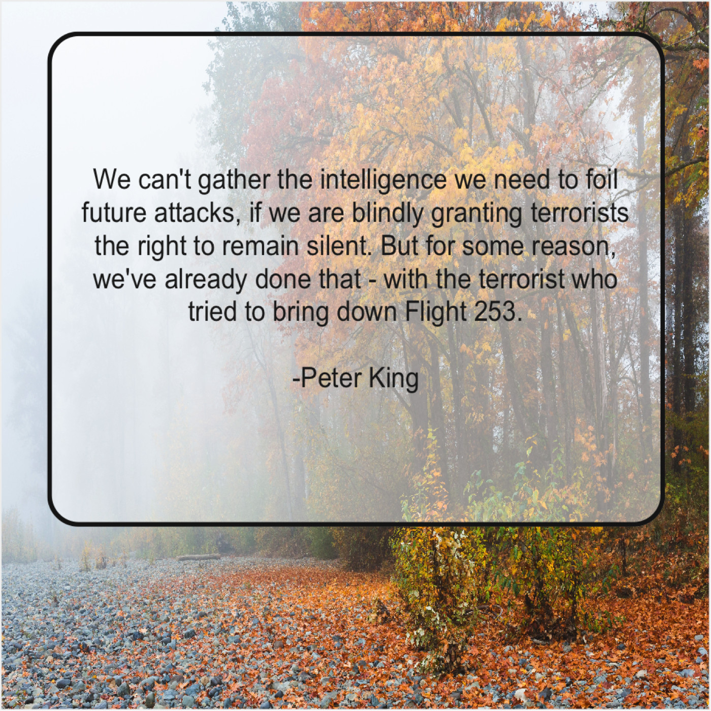 Peter King Peter King – We can’t gather the intelligence… February 9, 2019 admin “We can’t gather the intelligence we need to foil future attacks, if we are blindly granting terrorists the right to remain silent. But for some reason, we’ve already done that – with the terrorist who tried to bring down Flight 253.”-Peter King