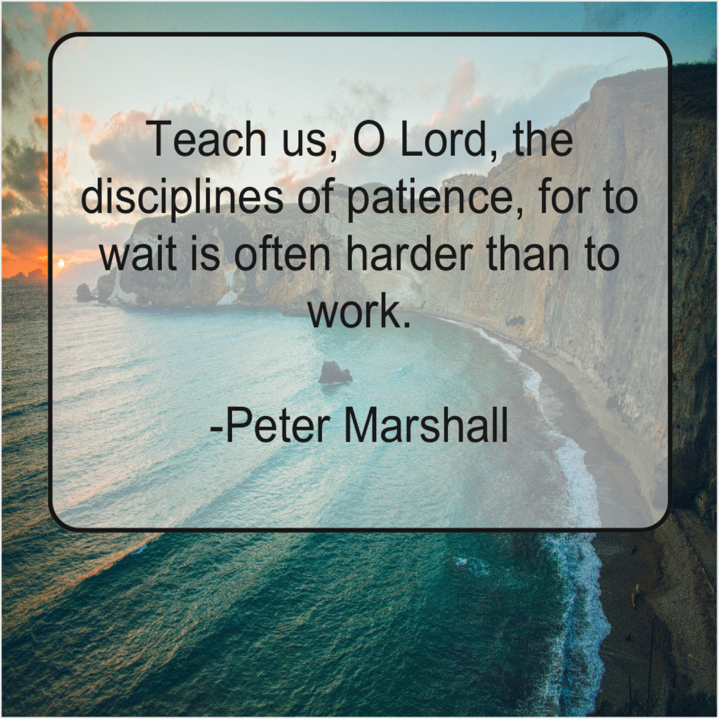 Peter Marshall Peter Marshall – Teach us, O Lord, the… June 16, 2019 admin “Teach us, O Lord, the disciplines of patience, for to wait is often harder than to work.”-Peter Marshall