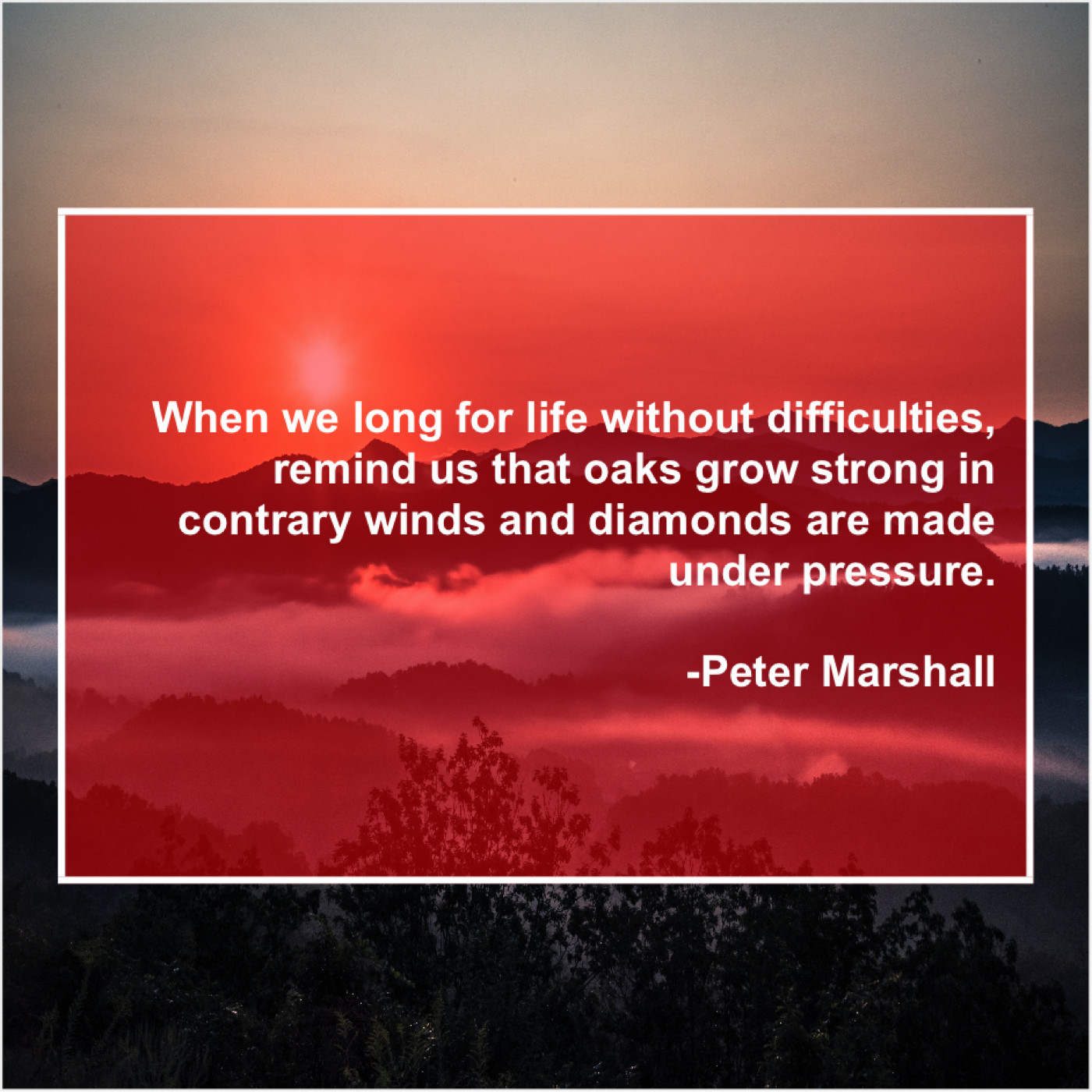 Peter Marshall Peter Marshall – When we long for life… February 26, 2019 admin “When we long for life without difficulties, remind us that oaks grow strong in contrary winds and diamonds are made under pressure.”-Peter Marshall