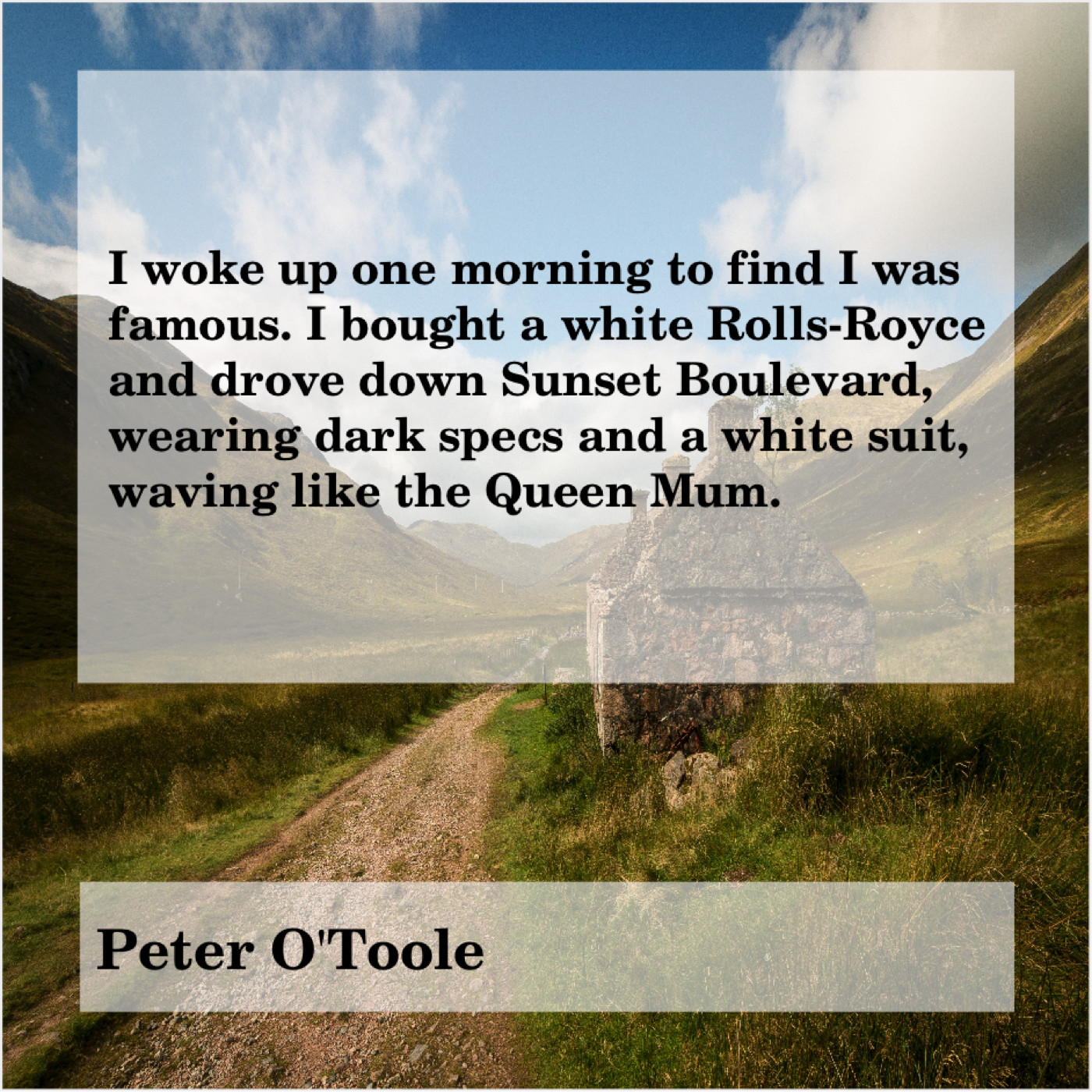 Peter O'Toole Peter O’Toole – I woke up one morning… July 19, 2019 admin “I woke up one morning to find I was famous. I bought a white Rolls-Royce and drove down Sunset Boulevard, wearing dark specs and a white suit, waving like the Queen Mum.”-Peter O’Toole
