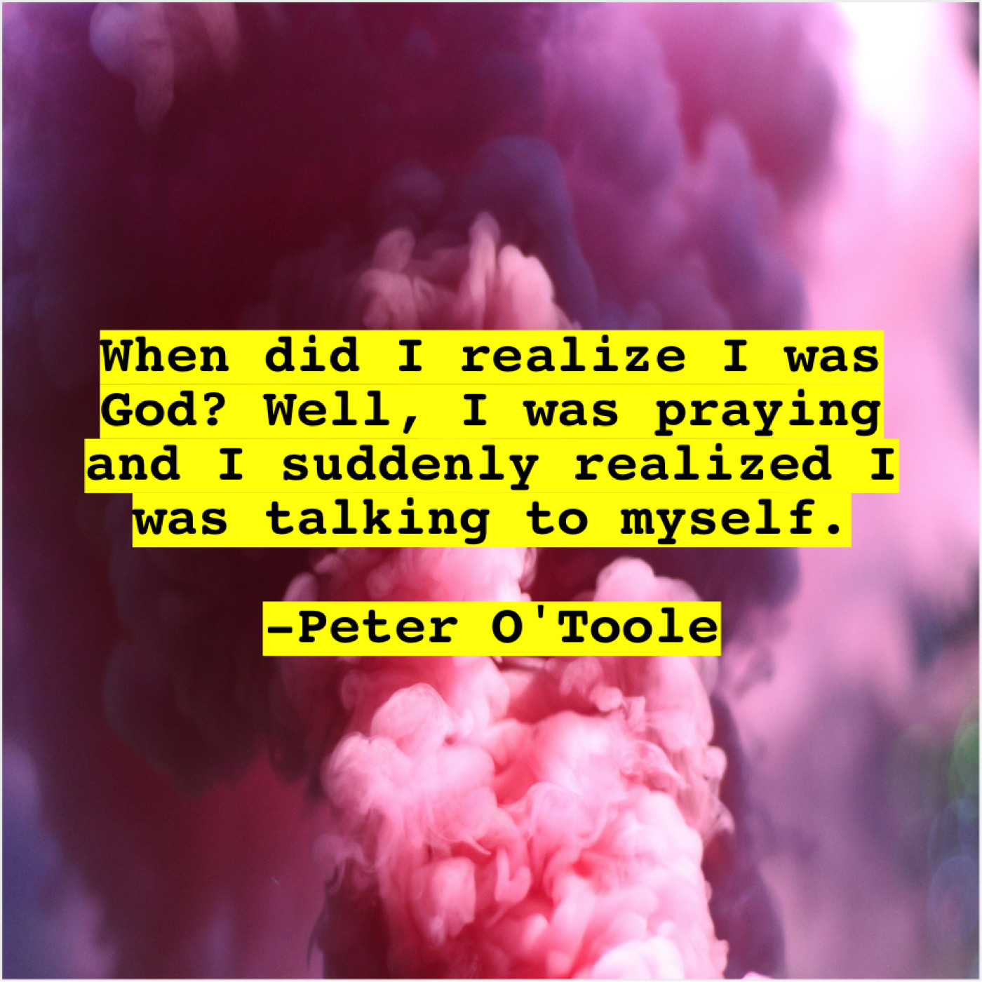 Peter O'Toole Peter O’Toole – When did I realize I… December 22, 2018 admin “When did I realize I was God? Well, I was praying and I suddenly realized I was talking to myself.”-Peter O’Toole