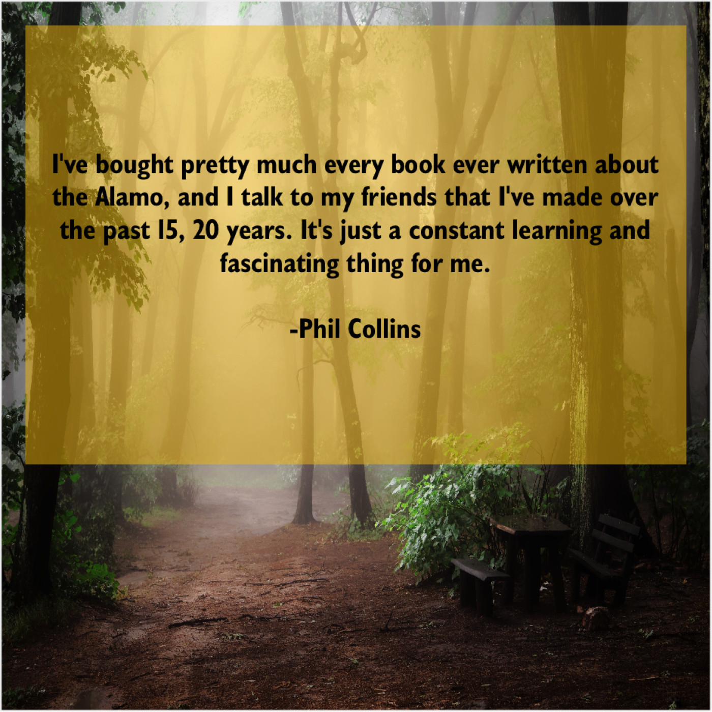 Phil Collins Phil Collins – I’ve bought pretty much every… June 13, 2019 admin “I’ve bought pretty much every book ever written about the Alamo, and I talk to my friends that I’ve made over the past 15, 20 years. It’s just a constant learning and fascinating thing for me.”-Phil Collins