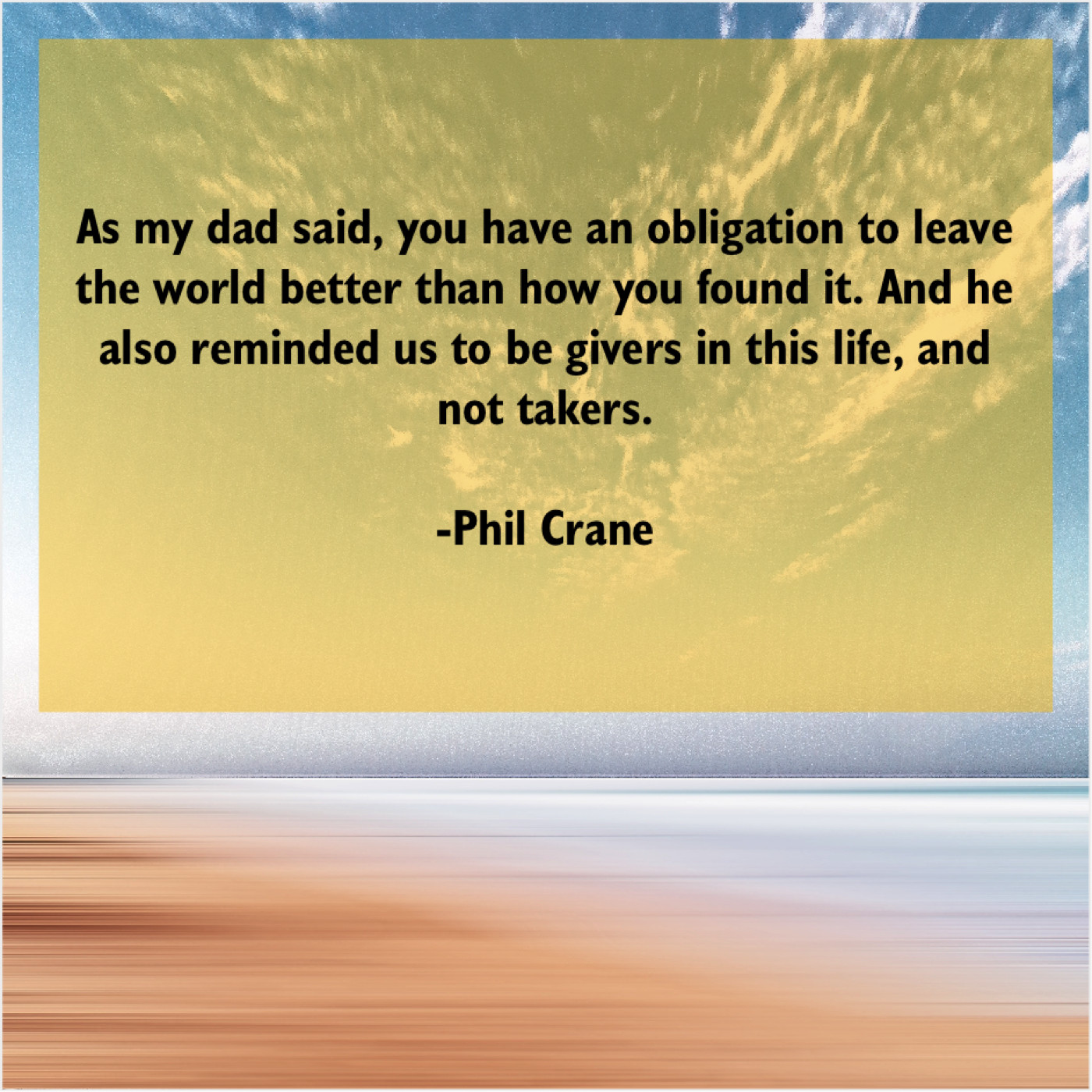 Phil Crane Phil Crane – As my dad said, you… April 12, 2019 admin “As my dad said, you have an obligation to leave the world better than how you found it. And he also reminded us to be givers in this life, and not takers.”-Phil Crane
