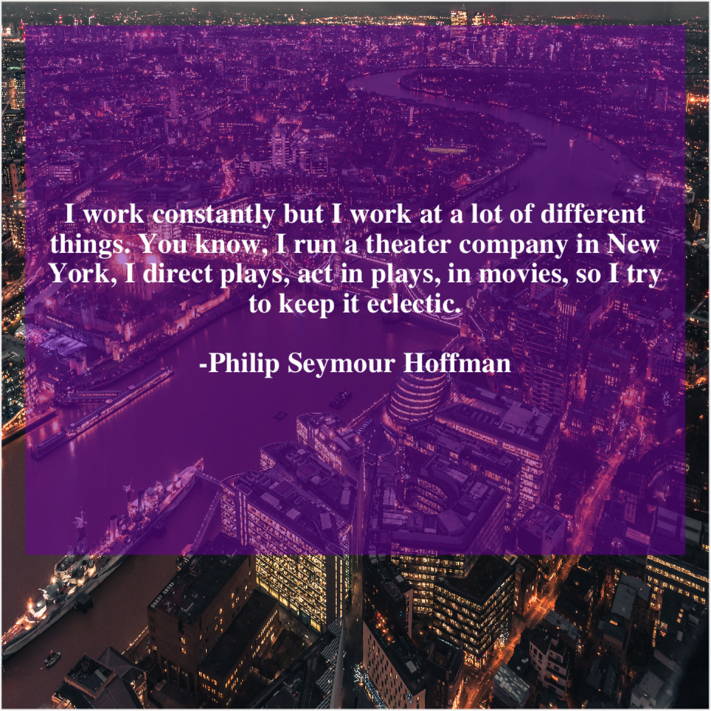 Philip Seymour Hoffman Philip Seymour Hoffman – I work constantly but I… April 1, 2019 admin “I work constantly but I work at a lot of different things. You know, I run a theater company in New York, I direct plays, act in plays, in movies, so I try to keep it eclectic.”-Philip Seymour Hoffman