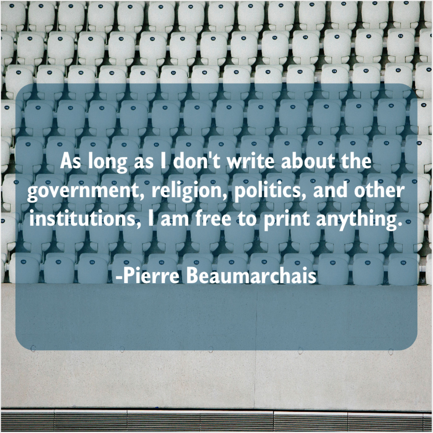 Pierre Beaumarchais Pierre Beaumarchais – As long as I don’t… August 23, 2019 admin “As long as I don’t write about the government, religion, politics, and other institutions, I am free to print anything.”-Pierre Beaumarchais