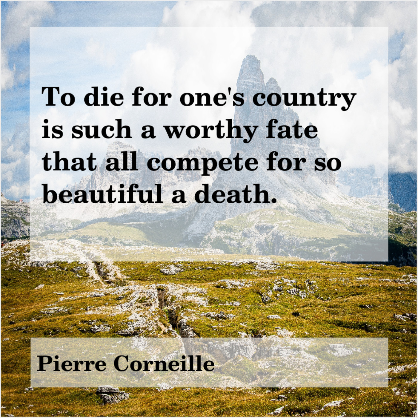 Pierre Corneille Pierre Corneille – To die for one’s country… January 12, 2019 admin “To die for one’s country is such a worthy fate that all compete for so beautiful a death.”-Pierre Corneille