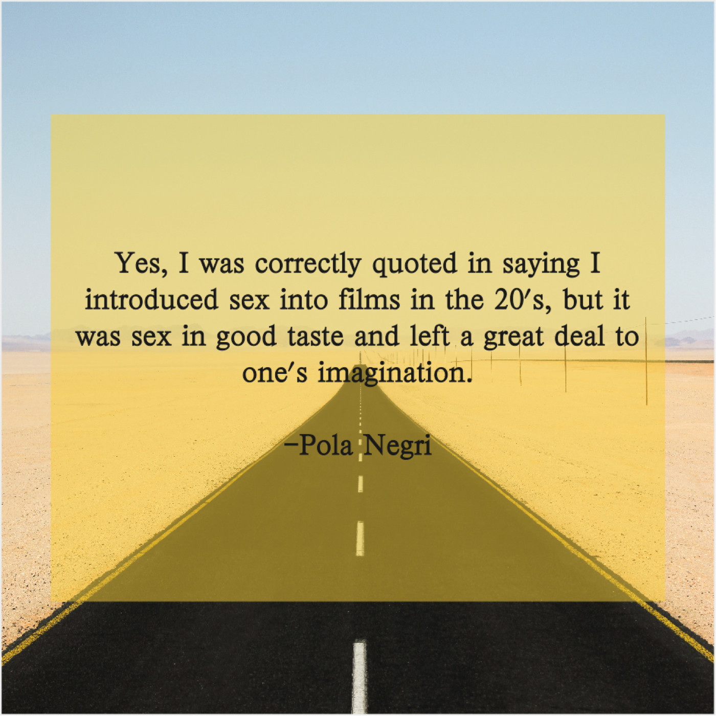 Pola Negri Pola Negri – Yes, I was correctly quoted… July 14, 2019 admin “Yes, I was correctly quoted in saying I introduced sex into films in the 20’s, but it was sex in good taste and left a great deal to one’s imagination.”-Pola Negri