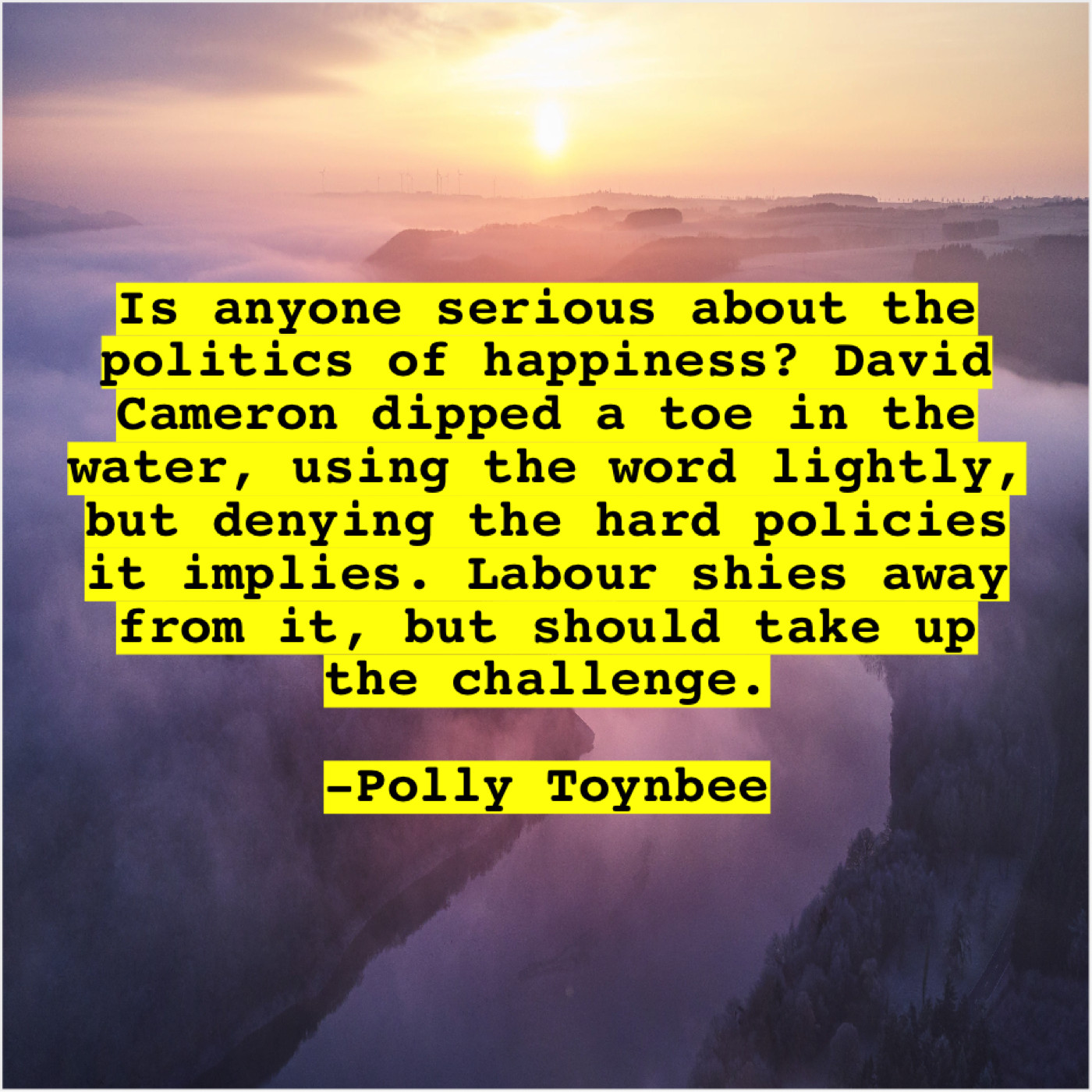 Polly Toynbee Polly Toynbee – Is anyone serious about the… February 6, 2019 admin “Is anyone serious about the politics of happiness? David Cameron dipped a toe in the water, using the word lightly, but denying the hard policies it implies. Labour shies away from it, but should take up the challenge.”-Polly Toynbee