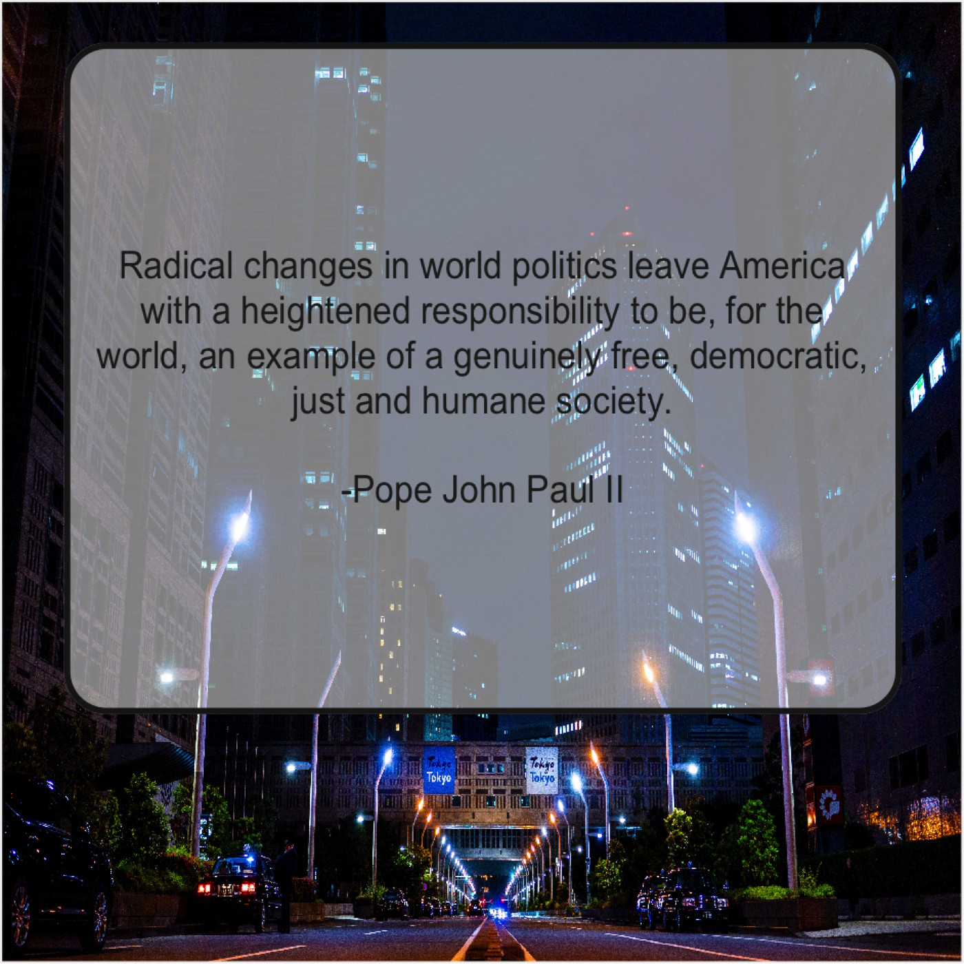 “Radical changes in world politics leave America with a heightened responsibility to be, for the world, an example of a genuinely free, democratic, just and humane society.”