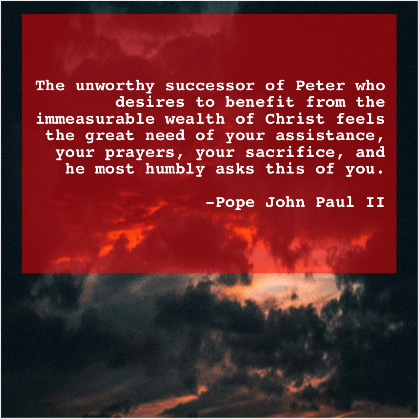 Pope John Paul II Pope John Paul II – The unworthy successor of Peter… December 23, 2018 admin “The unworthy successor of Peter who desires to benefit from the immeasurable wealth of Christ feels the great need of your assistance, your prayers, your sacrifice, and he most humbly asks this of you.”-Pope John Paul II