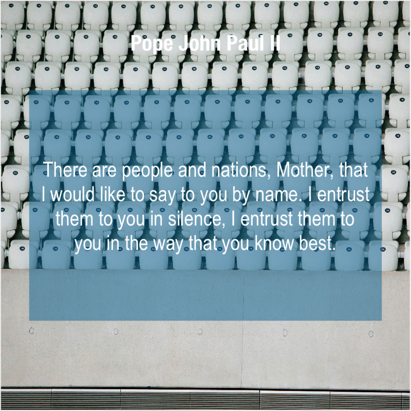 Pope John Paul II Pope John Paul II – There are people and nations… November 11, 2018 admin “There are people and nations, Mother, that I would like to say to you by name. I entrust them to you in silence, I entrust them to you in the way that you know best.”-Pope John Paul II