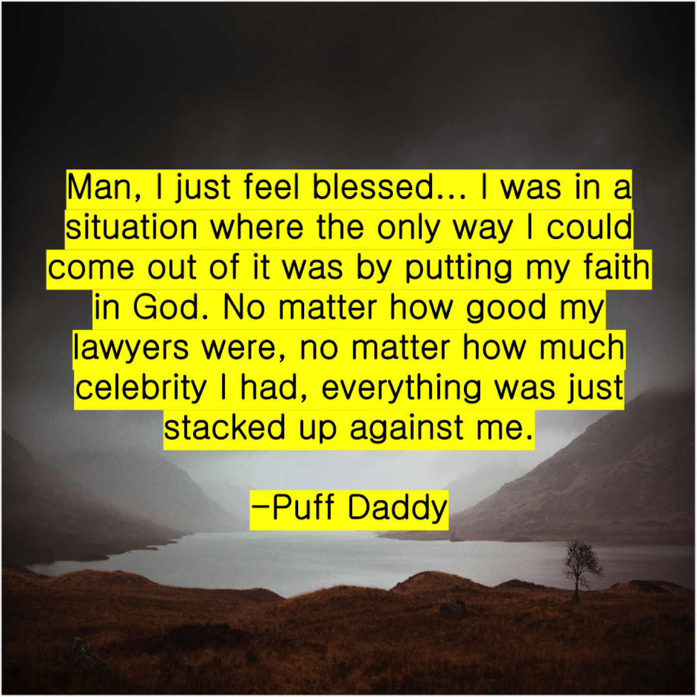 Puff Daddy Puff Daddy – Man, I just feel blessed… October 6, 2019 admin “Man, I just feel blessed… I was in a situation where the only way I could come out of it was by putting my faith in God. No matter how good my lawyers were, no matter how much celebrity I had, everything was just stacked up against me.”-Puff Daddy
