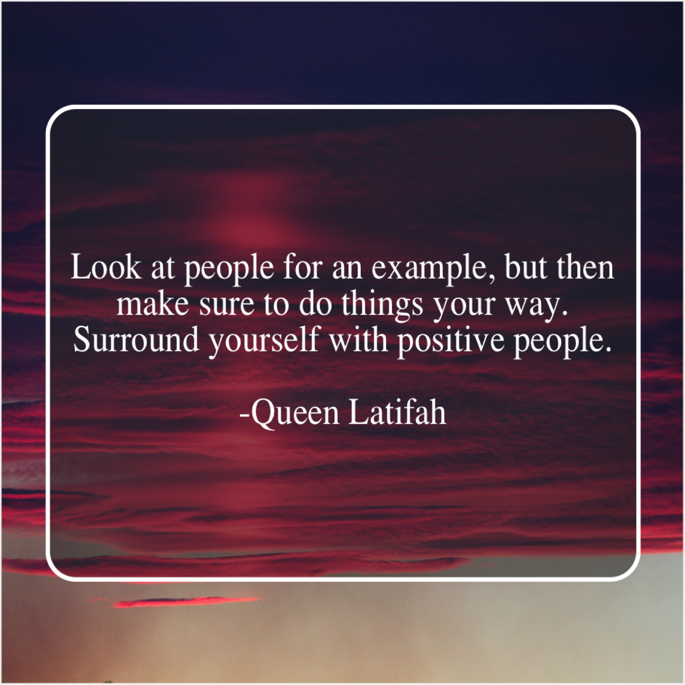Queen Latifah Queen Latifah – Look at people for an… November 24, 2018 admin “Look at people for an example, but then make sure to do things your way. Surround yourself with positive people.”-Queen Latifah