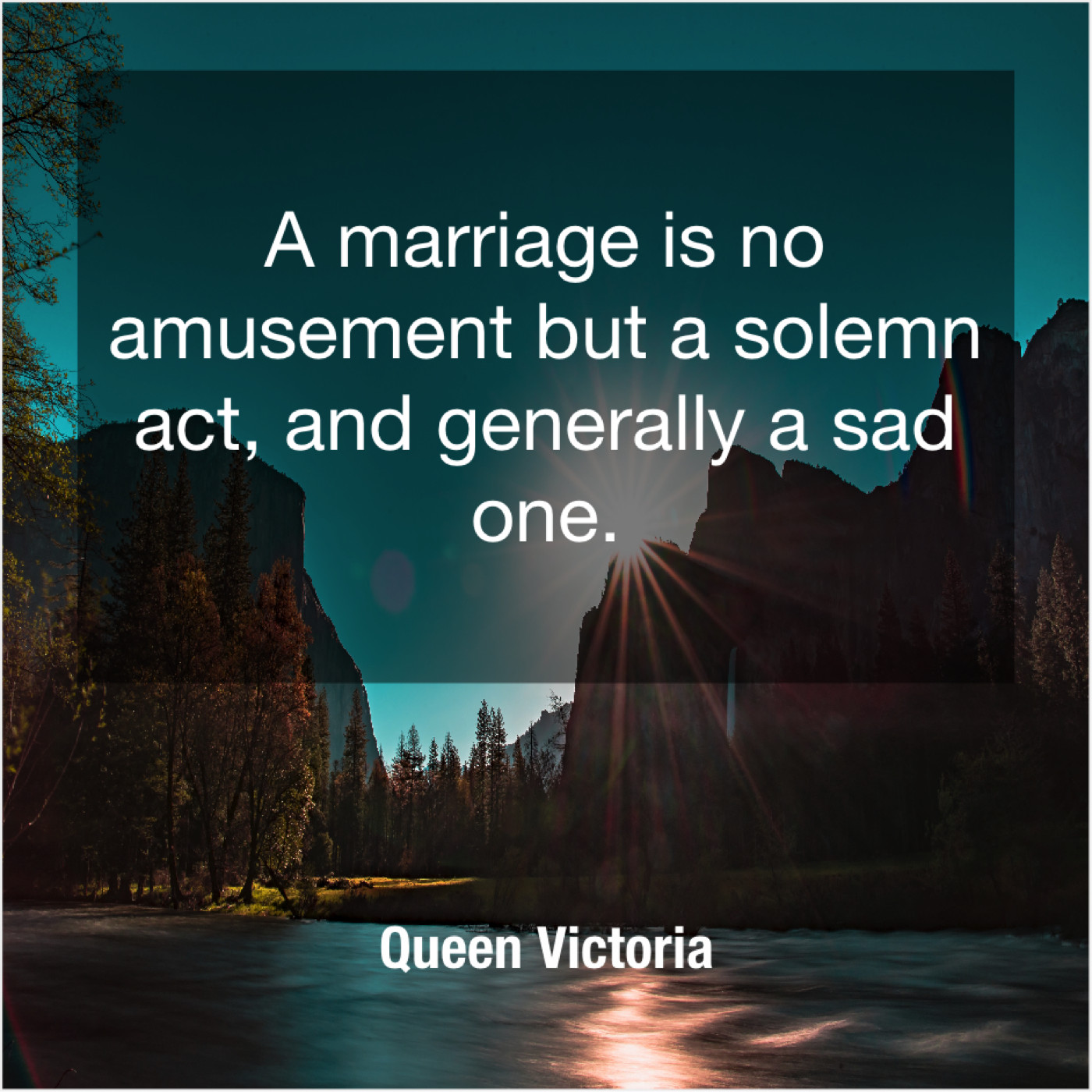 Queen Victoria Queen Victoria – A marriage is no amusement… June 7, 2019 admin “A marriage is no amusement but a solemn act, and generally a sad one.”-Queen Victoria