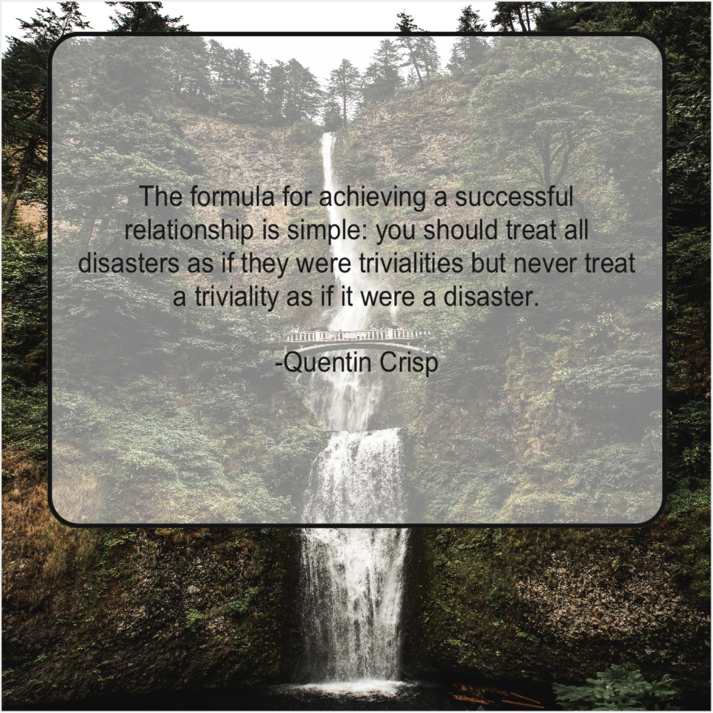 Quentin Crisp Quentin Crisp – The formula for achieving a… July 29, 2019 admin “The formula for achieving a successful relationship is simple: you should treat all disasters as if they were trivialities but never treat a triviality as if it were a disaster.”-Quentin Crisp