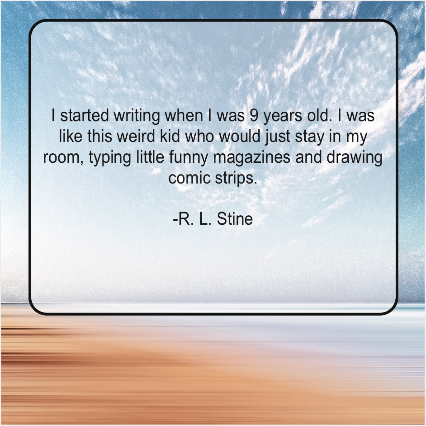 R. L. Stine R. L. Stine – I started writing when I… February 1, 2019 admin “I started writing when I was 9 years old. I was like this weird kid who would just stay in my room, typing little funny magazines and drawing comic strips.”-R. L. Stine
