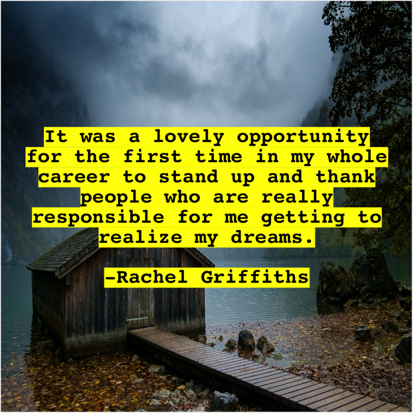 Rachel Griffiths Rachel Griffiths – It was a lovely opportunity… September 23, 2019 admin “It was a lovely opportunity for the first time in my whole career to stand up and thank people who are really responsible for me getting to realize my dreams.”-Rachel Griffiths